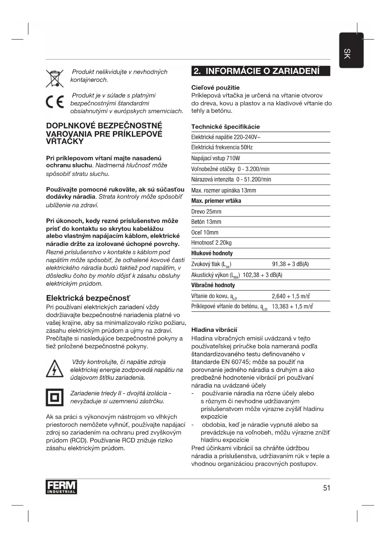 Cieľové použitie Príklepová vŕtačka je určená na vŕtanie otvorov do dreva, kovu a plastov a na kladivové vŕtanie do tehly a betónu. Technické špecikácie Elektrické napätie 220-240 V~ Elektrická frekvencia 50 Hz Napájací vstup 710 W Voľnobežné otáčky 0 - 3.200/min Nárazová intenzita 0 - 51.200/min Max. rozmer upináka 13 mm Max. priemer vrtáka Drevo 25 mm Betón 13 mm Oceľ 10 mm Hmotnosť 2.20 kg Hlukové hodnoty Zvukový tlak (L
