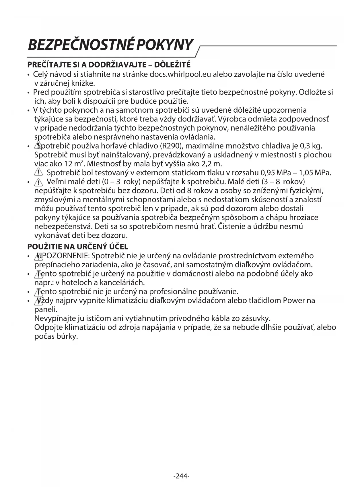 - Vonkajšia teplota je nižšia ako 18 °C. Nesnažte sa používať klimatizáciu vchladiacom režime, keď je vonkajšia teplota pod 18 °C. Poznámka: Ak problémy pretrvávajú, vypnite spotrebič, odpojte ho od zdroja napájania aobráťte sa na najbližšie autorizované servisné stredisko Whirlpool. Nepokúšajte sa presúvať, opravovať, rozmontovať alebo upraviť spotrebič sami.-259- POPREDAJNÝ SERVIS Prv než sa obrátite na stredisko starostlivosti ozákazníkov: