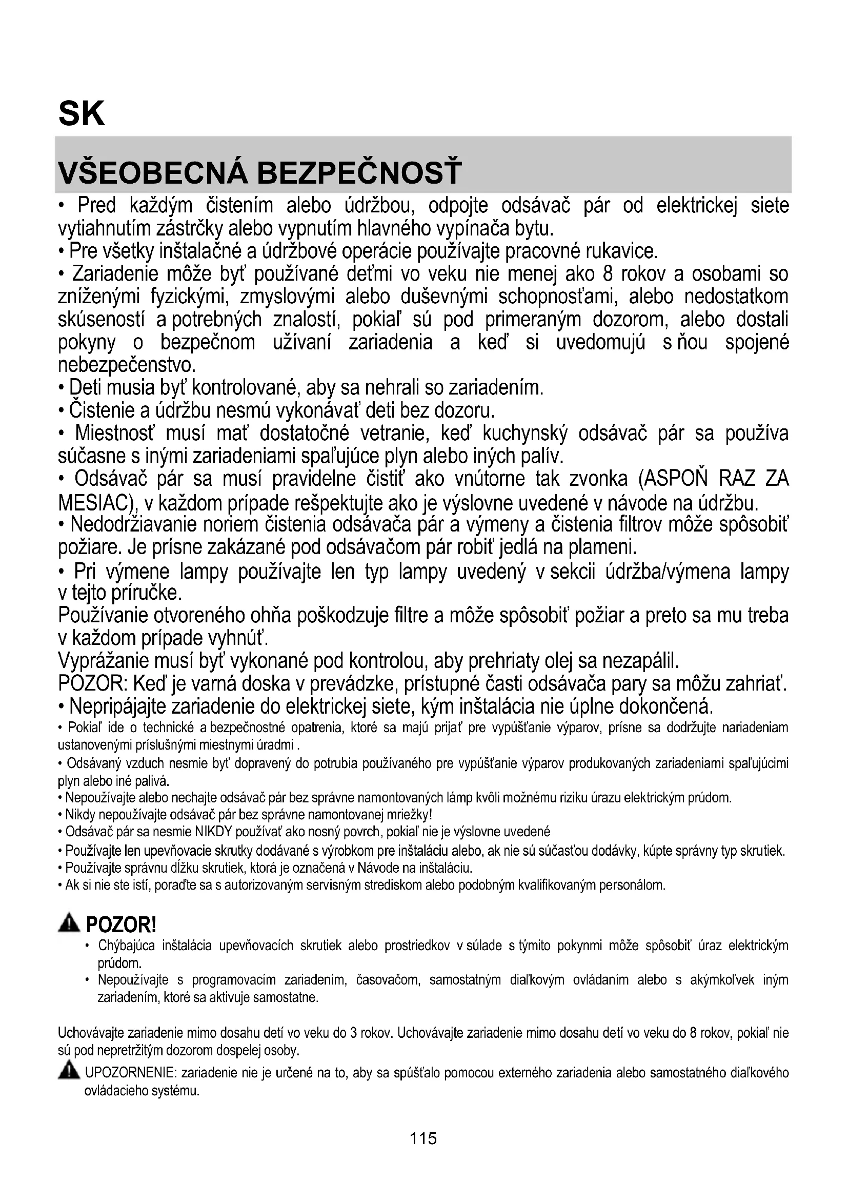 - Pri výmene lampy používajte len typ lampy uvedený v sekcii údržba/výmena lampy v tejto príručke. Používanie otvoreného ohňa poškodzuje filtre a môže spôsobiť požiar a preto sa mu treba v každom prípade vyhnúť. Vyprážanie musí byť vykonané pod kontrolou, aby prehriaty olej sa nezapálil. POZOR: Keď je varná doska v prevádzke, prístupné časti odsávača pary sa môžu zahriať.