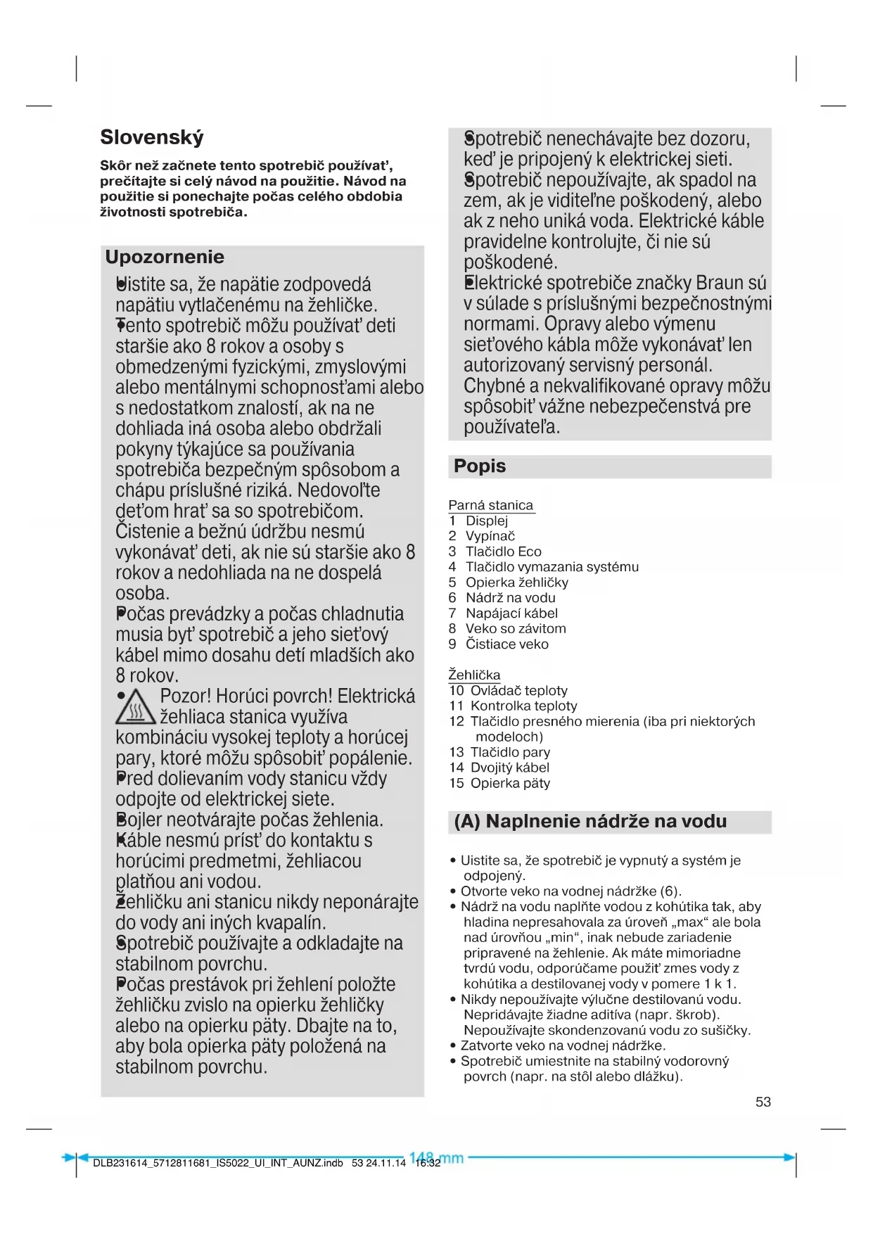 Elektrické spotrebiče značky Braun sú v súlade s príslušnými bezpečnostnými normami. Opravy alebo výmenu sieťového kábla môže vykonávať len autorizovaný servisný personál. Chybné a nekvalifikované opravy môžu spôsobiť vážne nebezpečenstvá pre používateľa. Popis Parná stanica 1 Displej 2 Vypínač 3 Tlačidlo Eco 4 Tlačidlo vymazania systému 5 Opierka žehličky 6 Nádrž na vodu 7 Napájací kábel 8 Veko so závitom 9 Čistiace veko Žehlička 10 Ovládač teploty 11 Kontrolka teploty 12 Tlačidlo presného mierenia (iba pri niektorých modeloch) 13 Tlačidlo pary 14 Dvojitý kábel 15 Opierka päty (A) Naplnenie nádrže na vodu