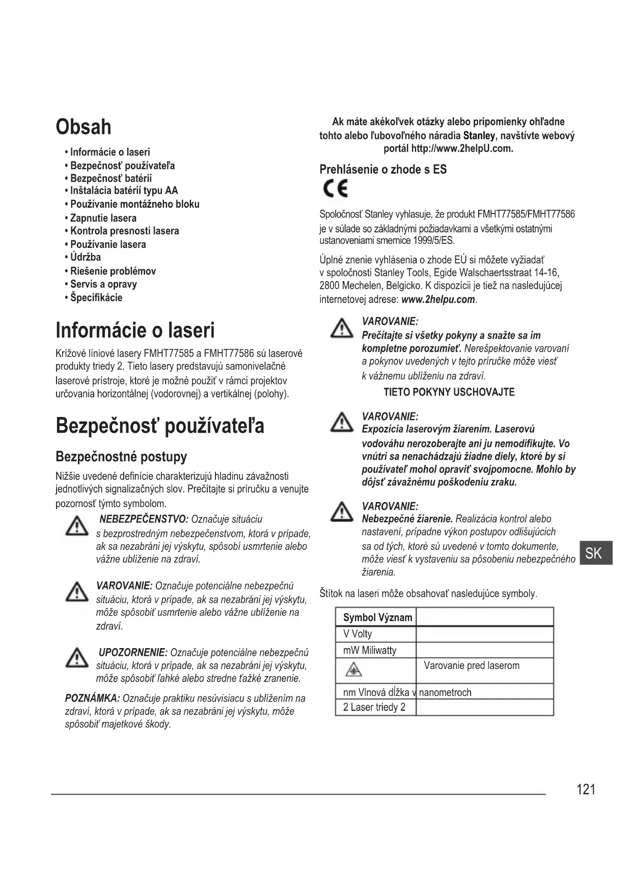 Varovné štítky Na laseri sa pre vašu informáciu a v záujme bezpečnosti nachádzajú nasledujúce štítky. VAROVANIE: Ak sa má znížiť riziko ublíženia na zdraví, používateľ je povinný si prečítať používateľskú príručku. VAROVANIE: LASEROVÉ ŽIARENIE. NEHĽAĎTE PRIAMO DO LÚČA. Laserový produkt triedy 2. www.STANLEYTOOLS.com FMHT77585 www.STANLEYTOOLS.com FMHT77585