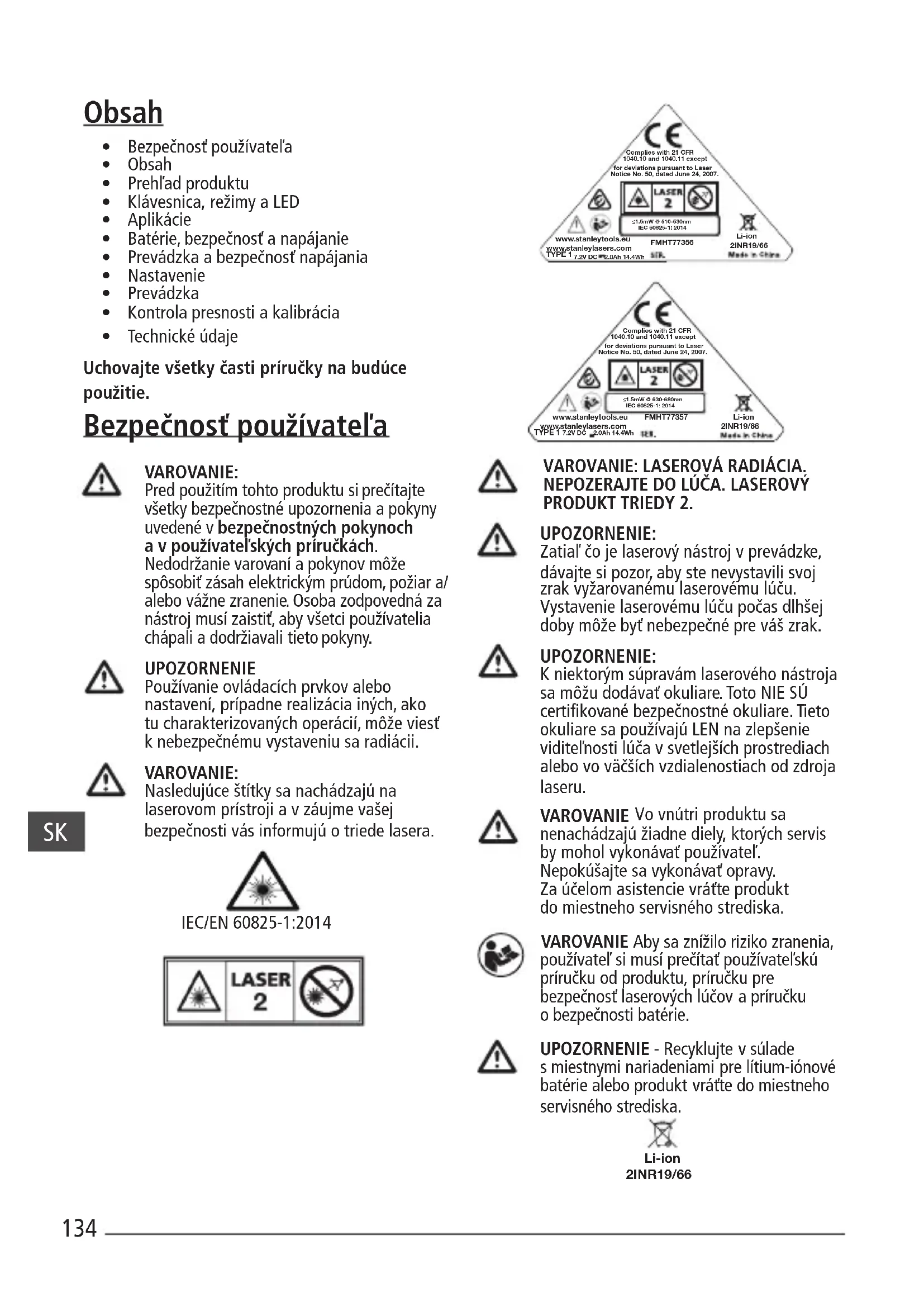 - Technické údaje Uchovajte všetky časti príručky na budúce použitie. Bezpečnosť používateľa VAROVANIE: Pred použitím tohto produktu si prečítajte všetky bezpečnostné upozornenia apokyny uvedené vbezpečnostných pokynoch avpoužívateľských príručkách. Nedodržanie varovaní apokynov môže spôsobiť zásah elektrickým prúdom, požiar a/ alebo vážne zranenie. Osoba zodpovedná za nástroj musí zaistiť, aby všetci používatelia chápali adodržiavali tieto pokyny. UPOZORNENIE Používanie ovládacích prvkov alebo nastavení, prípadne realizácia iných, ako tu charakterizovaných operácií, môže viesť knebezpečnému vystaveniu sa radiácii. VAROVANIE: Nasledujúce štítky sa nachádzajú na laserovom prístroji avzáujme vašej bezpečnosti vás informujú otriede lasera.