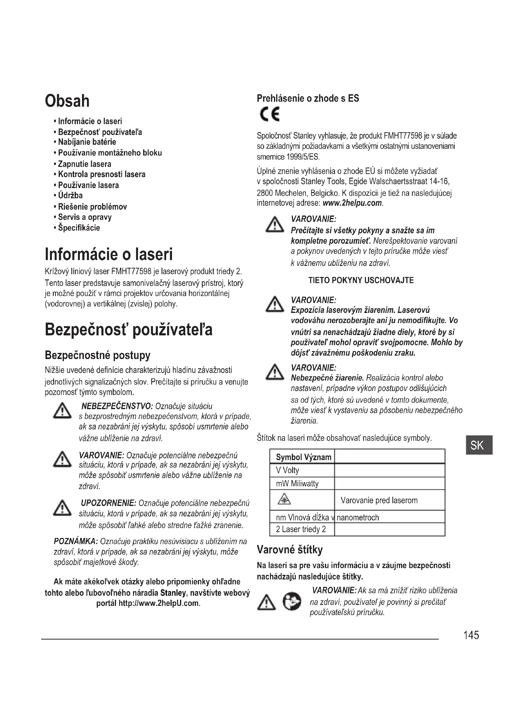 - Špecikácie Informácie o laseri Krížový líniový laser FMHT77598 je laserový produkt triedy 2. Tento laser predstavuje samonivelačný laserový prístroj, ktorý je možné použiť v rámci projektov určovania horizontálnej (vodorovnej) a vertikálnej (zvislej) polohy. Bezpečnosť používateľa Bezpečnostné postupy Nižšie uvedené denície charakterizujú hladinu závažnosti jednotlivých signalizačných slov. Prečítajte si príručku a venujte pozornosť týmto symbolom. NEBEZPEČENSTVO: Označuje situáciu s bezprostredným nebezpečenstvom, ktorá v prípade, ak sa nezabráni jej výskytu, spôsobí usmrtenie alebo vážne ublíženie na zdraví. VAROVANIE: Označuje potenciálne nebezpečnú situáciu, ktorá v prípade, ak sa nezabráni jej výskytu, môže spôsobiť usmrtenie alebo vážne ublíženie na zdraví. UPOZORNENIE: Označuje potenciálne nebezpečnú situáciu, ktorá v prípade, ak sa nezabráni jej výskytu, môže spôsobiť ľahké alebo stredne ťažké zranenie. POZNÁMKA: Označuje praktiku nesúvisiacu s ublížením na zdraví, ktorá v prípade, ak sa nezabráni jej výskytu, môže spôsobiť majetkové škody. Ak máte akékoľvek otázky alebo pripomienky ohľadne tohto alebo ľubovoľného náradia Stanley, navštívte webový portál http://www.2helpU.com. Prehlásenie o zhode s ES Spoločnosť Stanley vyhlasuje, že produkt FMHT77598 je v súlade so základnými požiadavkami a všetkými ostatnými ustanoveniami smernice 1999/5/ES. Úplné znenie vyhlásenia o zhode EÚ si môžete vyžiadať v spoločnosti Stanley Tools, Egide Walschaertsstraat 14-16, 2800 Mechelen, Belgicko. K dispozícii je tiež na nasledujúcej internetovej adrese: www.2helpu.com. VAROVANIE: Prečítajte si všetky pokyny a snažte sa im kompletne porozumieť. Nerešpektovanie varovaní a pokynov uvedených v tejto príručke môže viesť k vážnemu ublíženiu na zdraví.