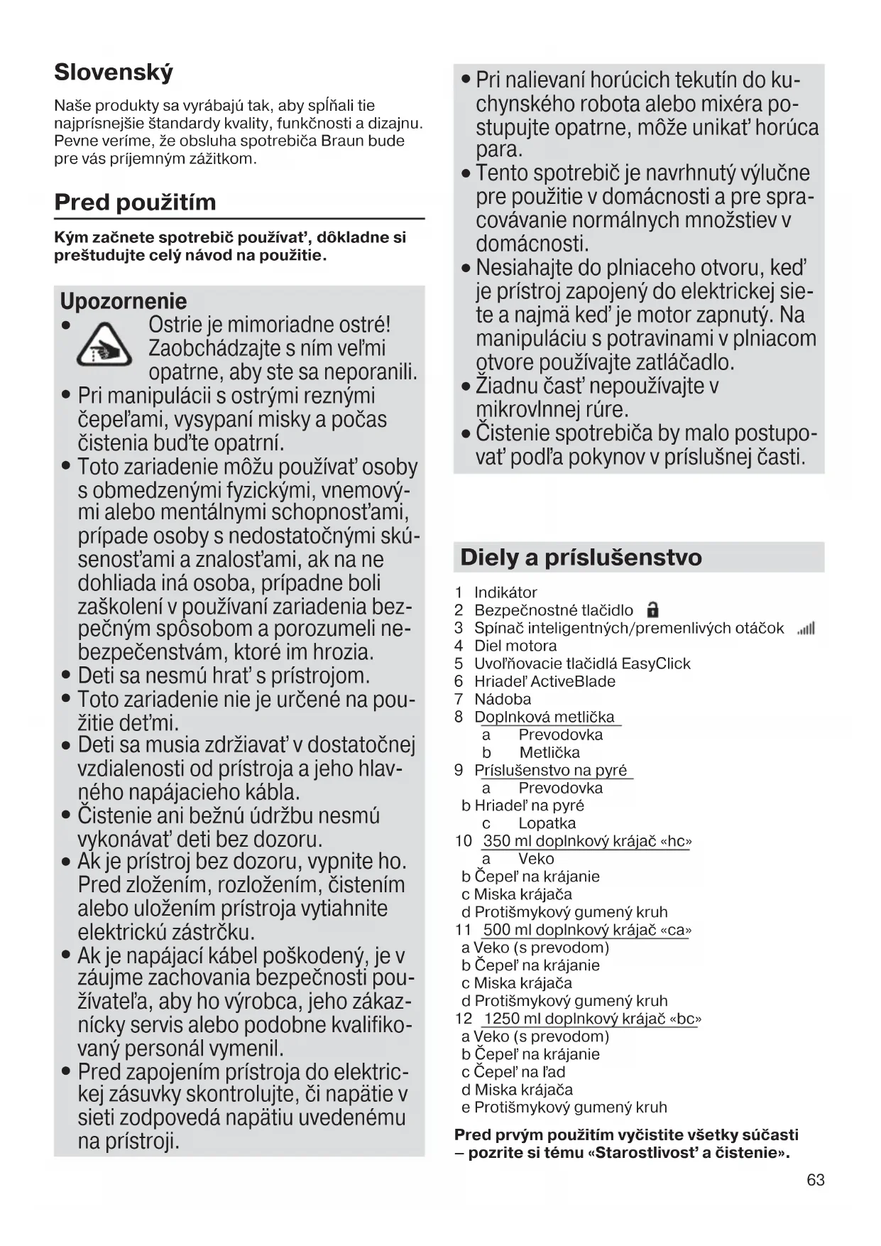 Čistenie spotrebiča by malo postupo- vať podľa pokynov v príslušnej časti. Diely a príslušenstvo 1 Indikátor 2 Bezpečnostné tlačidlo 3 Spínač inteligentných/premenlivých otáčok 4 Diel motora 5 Uvoľňovacie tlačidlá EasyClick 6 Hriadeľ ActiveBlade 7 Nádoba 8 Doplnková metlička a Prevodovka b Metlička 9 Príslušenstvo na pyré a Prevodovka b Hriadeľ na pyré c Lopatka 10 350 ml doplnkový krájač «hc» a Veko b Čepeľ na krájanie c Miska krájača d Protišmykový gumený kruh 11 500 ml doplnkový krájač «ca» a Veko (s prevodom) b Čepeľ na krájanie c Miska krájača d Protišmykový gumený kruh 12 1250 ml doplnkový krájač «bc» a Veko (s prevodom) b Čepeľ na krájanie c Čepeľ na ľad d Miska krájača e Protišmykový gumený kruh Pred prvým použitím vyčistite všetky súčasti – pozrite si tému «Starostlivosť a čistenie». 5722112414_MQ9045X_INT_S6-116.indd 63 17.10.16 11:2164 Indikátor Indikátor (1) signalizuje stav spotrebiča, keď je pripojený k elektrickej zásuvke. Indikátor SpotrebiĀ/prevádzkový stav Bliká naȏerveno Spotrebiȏ je pripravený na používanie. Svieti nazeleno Spotrebiȏ je uvoȦnený (prepínacie tlaȏidlo uvoȦnenia je stlaȏené) a dá sa zapnúȶ. Svieti naȏerveno Vȏasné varovanie pred prehriatím. Otáȏky motora postupne klesajú, až kým sa motor nevypne. Zari- adenie nechajte vychladnúȶ. Keȑ bude indikátor blikaȶ naȏerveno, spotrebiȏ je znovu pripravený na použitie. Ak maximálne otáčky klesnú pri vysokom zaťažení a dlhej dobe prevádzky, napriek tomu môžete dokončiť prípravu. Následne by ste však spotrebič mali nechať vychladnúť. Obsluha spotrebiča Spínač inteligentných otáčok pre variabilné otáčky Jedno stlačenie, všetky otáčky. Čím viac stlačíte, tým vyššie budú otáčky. Čím vyššie sú otáčky, tým rýchlejšie a jemnejšie budú výsledky mixovania a krájania. Obsluha jednou rukou: spínač inteligentných otáčok (3) vám umožňuje zapnúť spotrebič a ovládať otáčky jednou rukou. Obsluha ručného mixéra Prvé použitie: Odstráňte prepravnú zámku z dielu motora (4) potiahnutím za červený pásik. Zapnutie (A) Spotrebič sa dodáva vybavený bezpečnostným tlačidlom na uvoľnenie spínača inteligentných otáčok. Ak ho chcete bezpečne zapnúť, dodržiavajte tieto zásady: