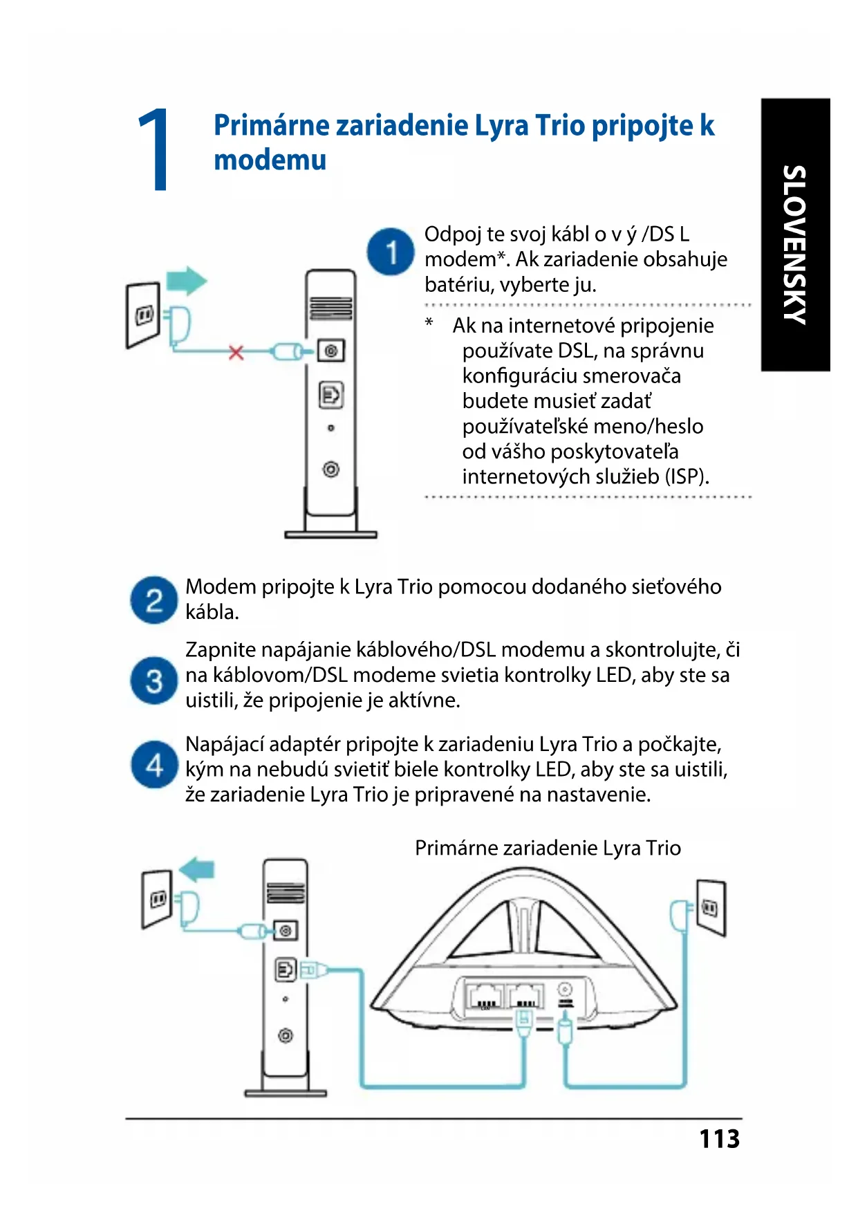 - Ak na internetové pripojenie používate DSL, na správnu konguráciu smerovača budete musieť zadať používateľské meno/heslo od vášho poskytovateľa internetových služieb (ISP). Zapnite napájanie káblového/DSL modemu a skontrolujte, či na káblovom/DSL modeme svietia kontrolky LED, aby ste sa uistili, že pripojenie je aktívne.