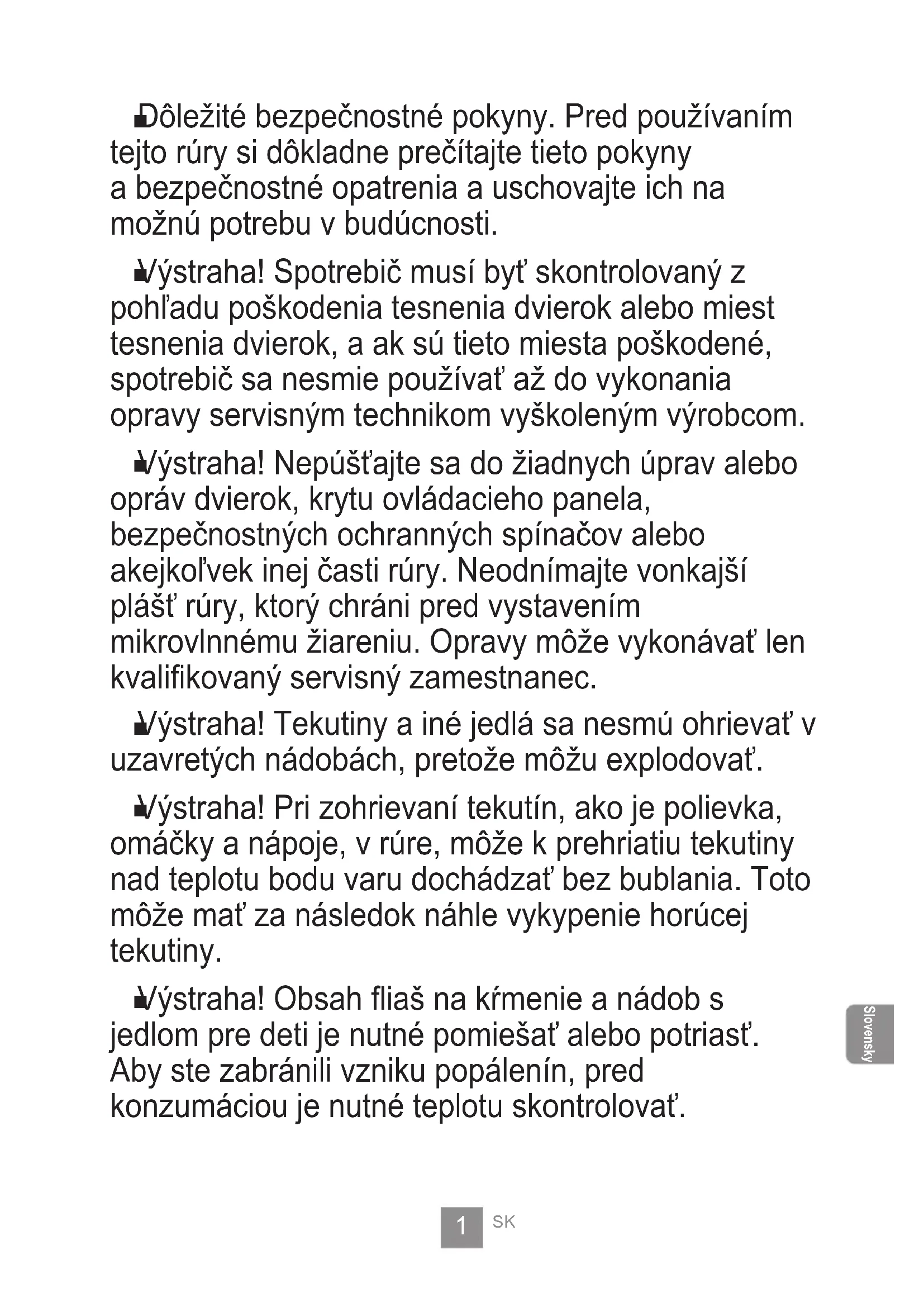 Výstraha! Tekutiny a iné jedlá sa nesmú ohrievať v uzavretých nádobách, pretože môžu explodovať.