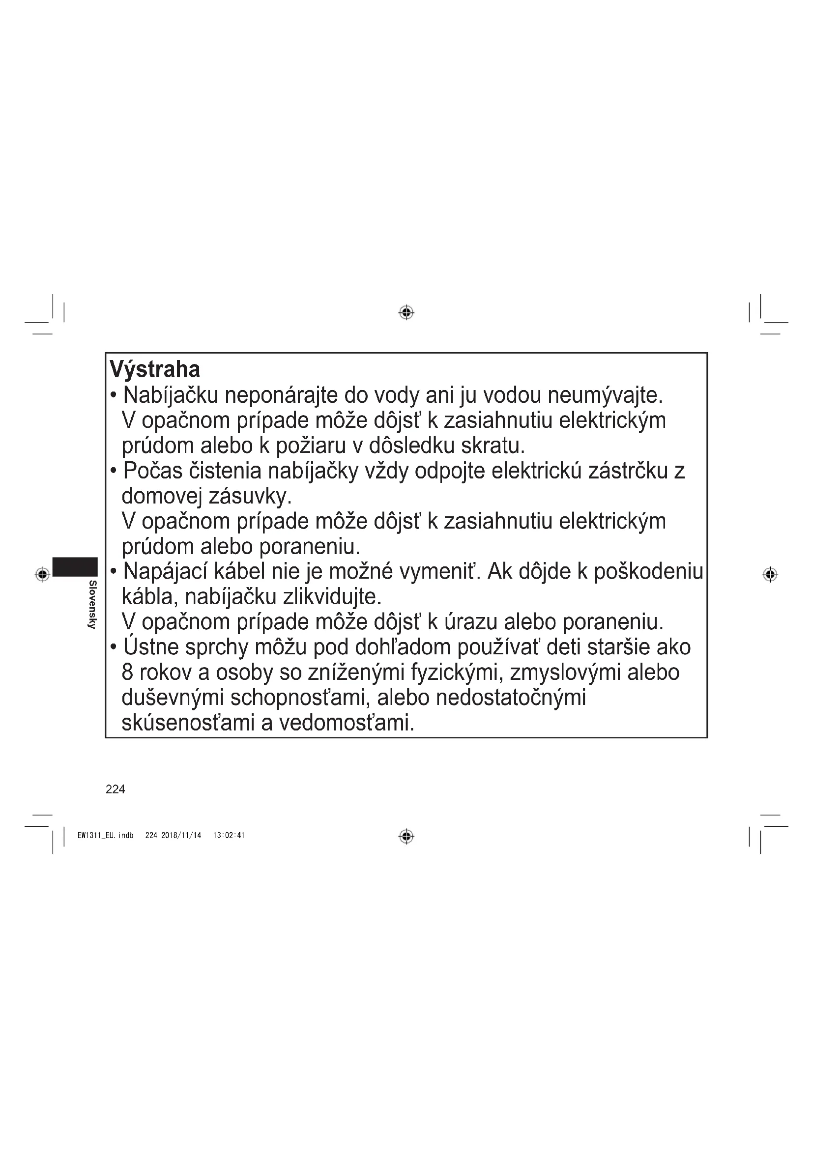 V opačnom prípade môže dôjsť k zasiahnutiu elektrickým prúdom alebo k požiaru v dôsledku skratu. EW1311_EU.indb 228 2018/11/14 13:02:41229 Slovensky UPOZORNENIE Popoužitíprístrojvždyošetriteavyčistite. (Pozritestranu234.)