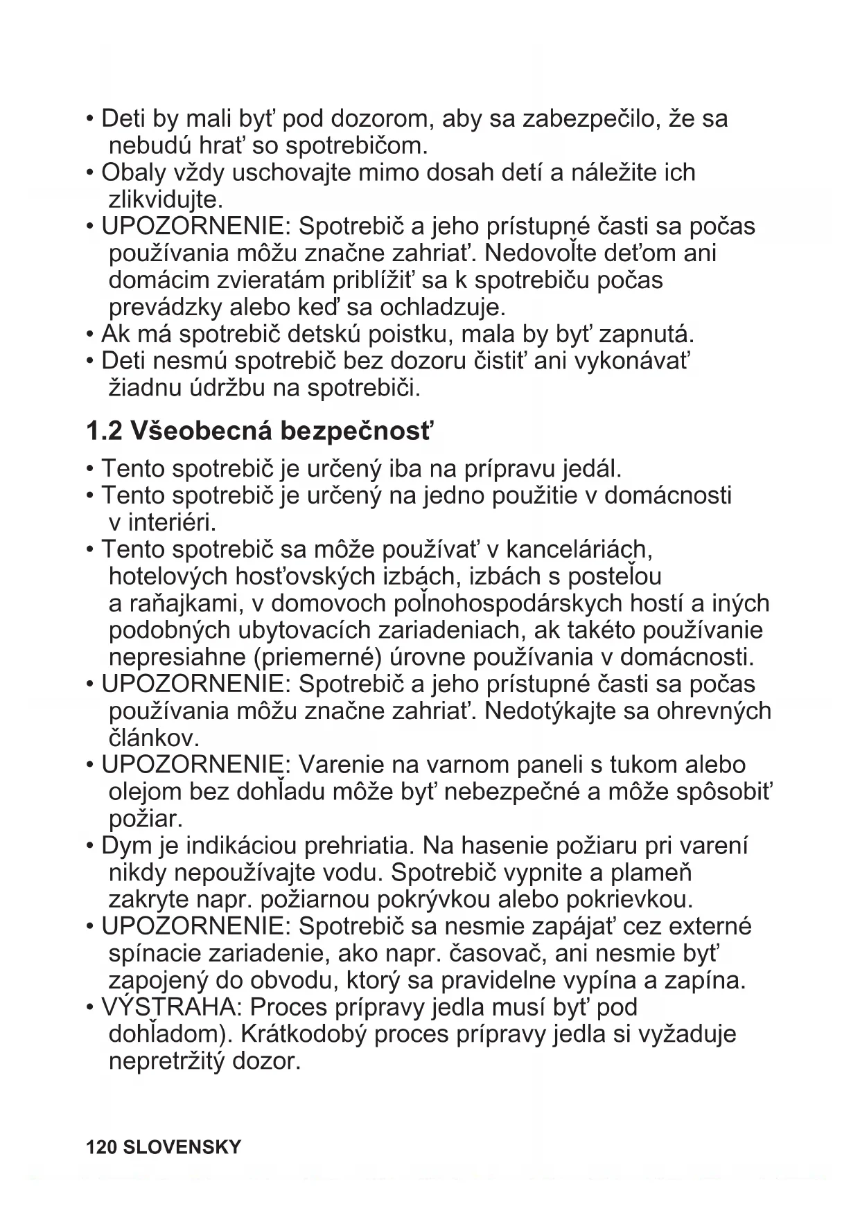 - VÝSTRAHA: Proces prípravy jedla musí byť pod dohľadom). Krátkodobý proces prípravy jedla si vyžaduje nepretržitý dozor. 120 SLOVENSKY• UPOZORNENIE: Nebezpečenstvo požiaru: Na varných povrchoch neskladujte žiadne predmety.