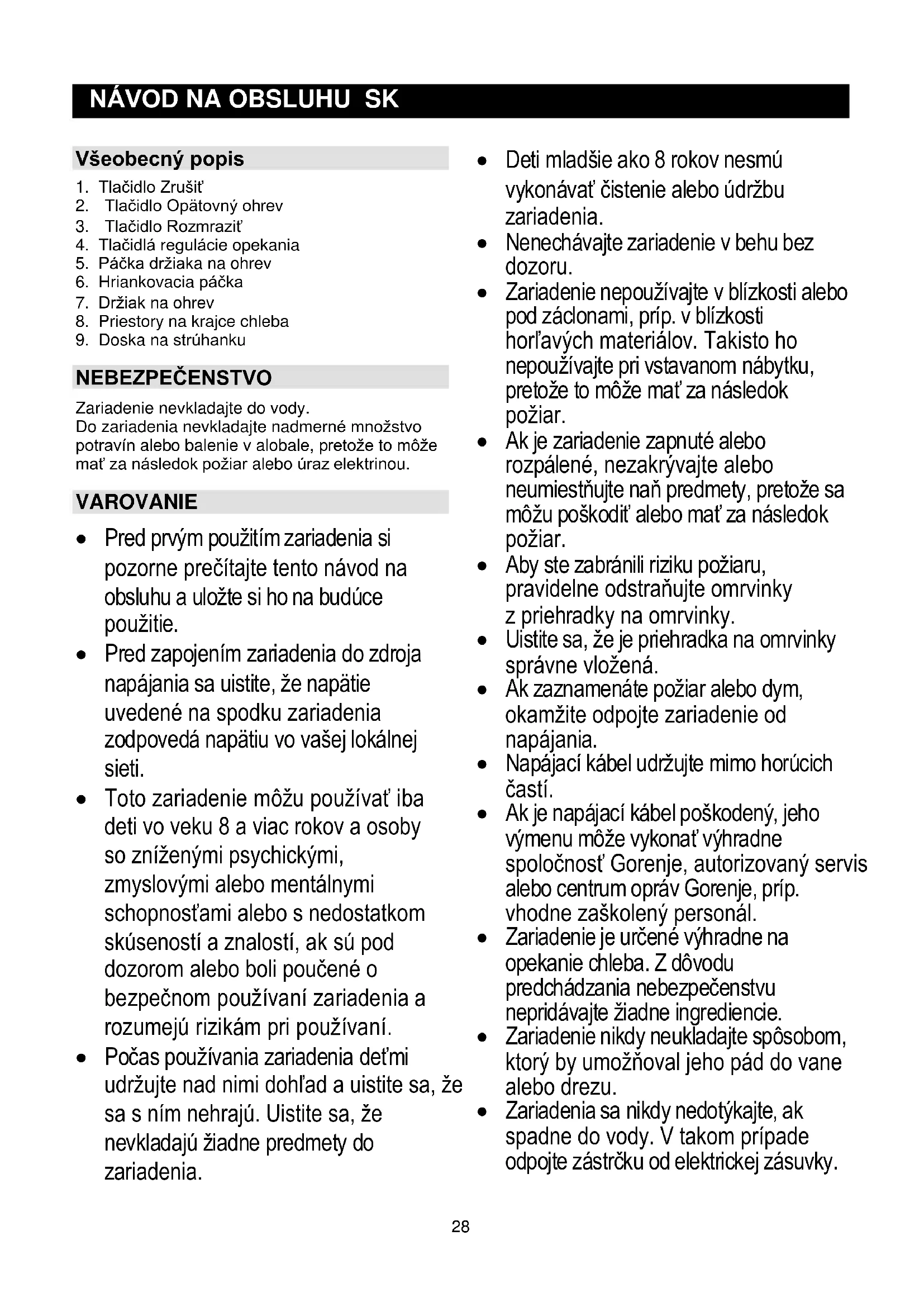 - Zariadenie je určené výhradne na opekanie chleba. Z dôvodu predchádzania nebezpečenstvu nepridávajte žiadne ingrediencie.