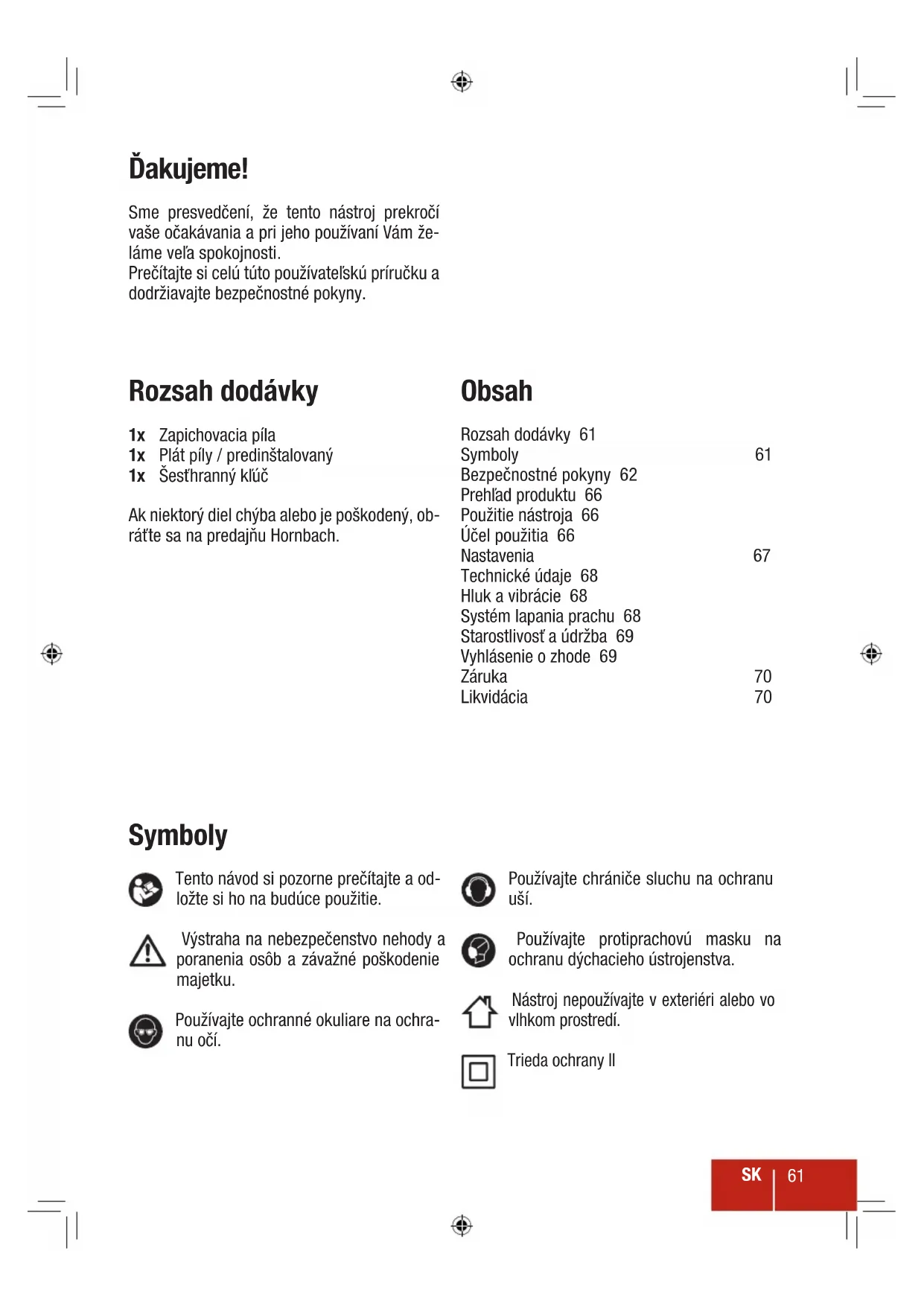 Tieto Výstražné upozomenia a bezpečnostné pokyny starostlivo uschovajte na budúce použitie.