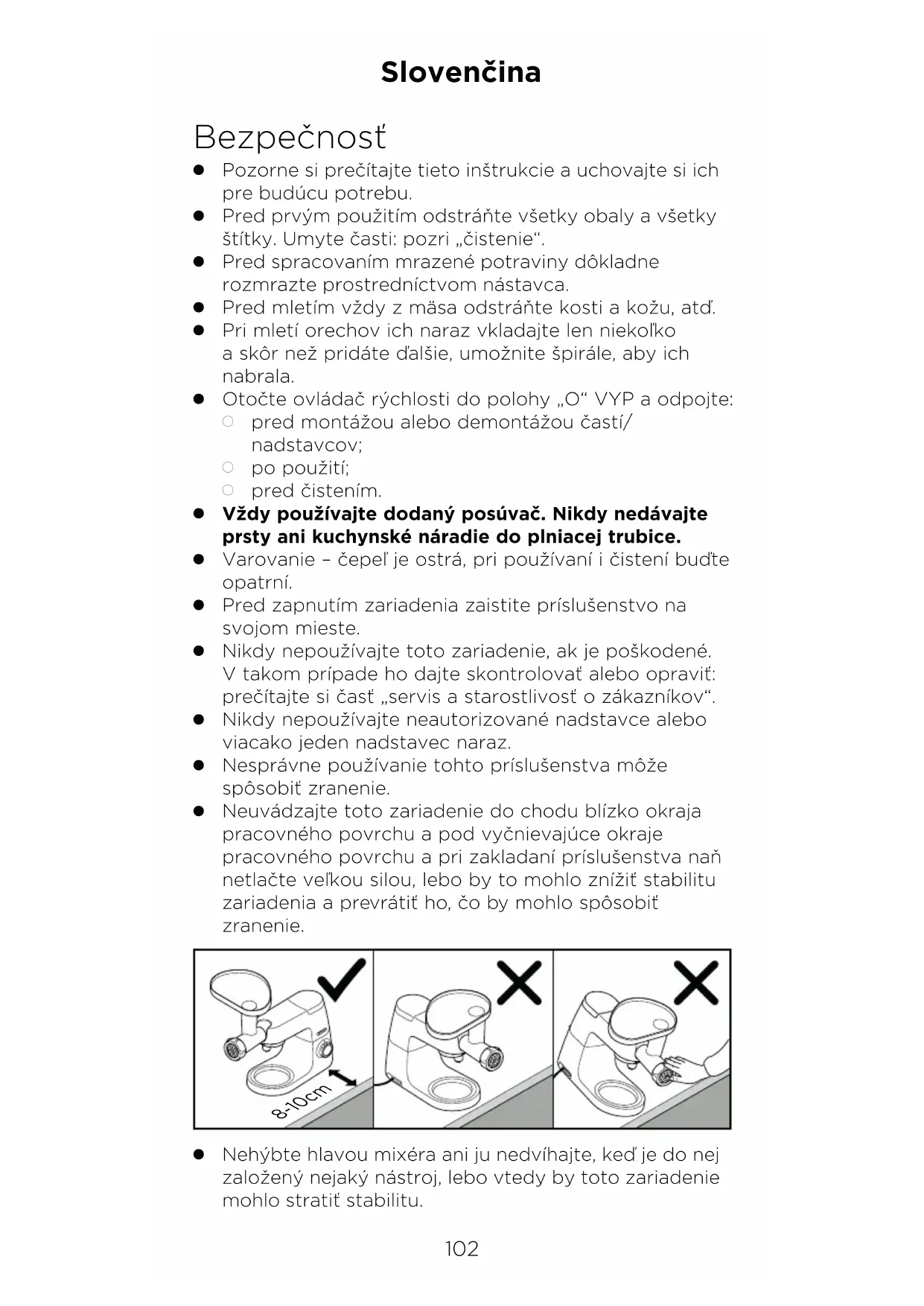 Κατασκευάστηκε στην Κίνα.102 Bezpečnosť OPozorne si prečítajte tieto inštrukcie a uchovajte si ich pre budúcu potrebu.OPred prvým použitím odstráňte všetky obaly a všetky štítky. Umyte časti: pozri „čistenie“.OPred spracovaním mrazené potraviny dôkladne rozmrazte prostredníctvom nástavca.OPred mletím vždy z mäsa odstráňte kosti a kožu, atď.OPri mletí orechov ich naraz vkladajte len niekoľko a skôr než pridáte ďalšie, umožnite špirále, aby ich nabrala.OOtočte ovládač rýchlosti do polohy „O“ VYP a odpojte: