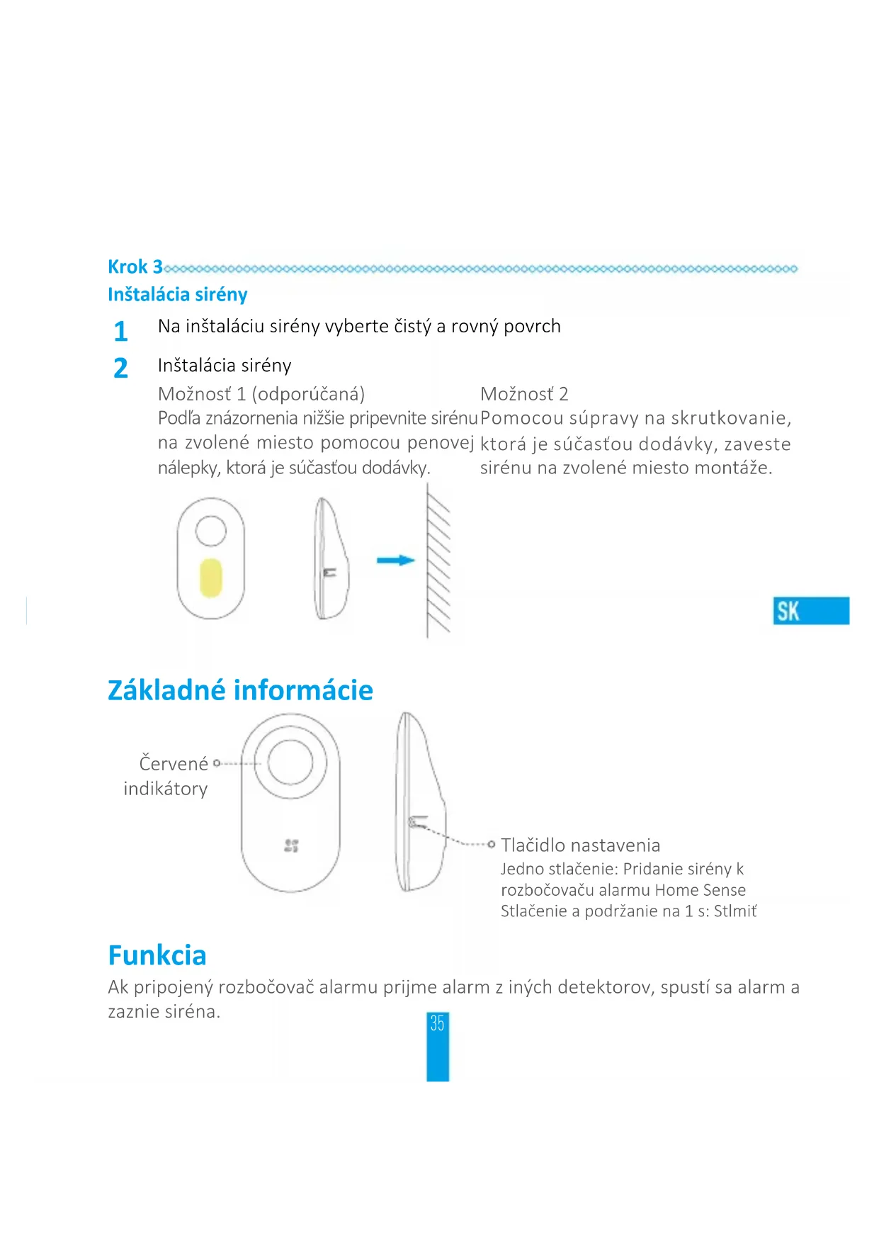 Vykonajte test sirény. - Stlačte tiesňové tlačidlo na diaľkovom ovládaní rozbočovača alarmu, čím spustíte alarm tiesňovej situácie. Ak siréna spustí alarm, bola úspešne pridaná k internetovému rozbočovaču alarmu. - Stlačením tlačidla stlmenia na diaľkovom ovládaní rozbočovača alarmu vymažete alarm a zastavíte zvuk sirény.35 Krok 3 Inštalácia sirény