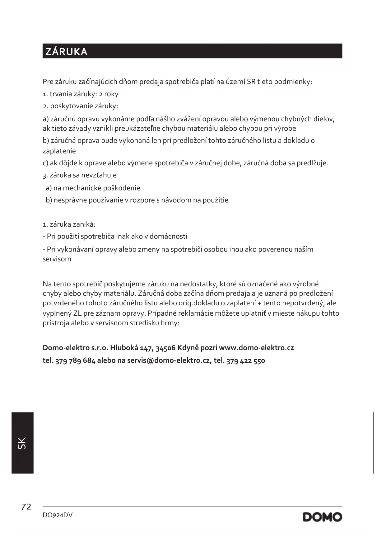 - Pri použití spotrebiča inak ako v domácnosti - Pri vykonávaní opravy alebo zmeny na spotrebiči osobou inou ako poverenou naším servisom Na tento spotrebič poskytujeme záruku na nedostatky, ktoré sú označené ako výrobné chyby alebo chyby materiálu. Záručná doba začína dňom predaja a je uznaná po predložení potvrdeného tohoto záručného listu alebo orig.dokladu o zaplatení + tento nepotvrdený, ale vyplnený ZL pre záznam opravy. Prípadné reklamácie môžete uplatniť v mieste nákupu tohto prístroja alebo v servisnom stredisku rmy: Domo-elektro s.r.o. Hluboká 147, 34506 Kdyně pozri www.domo-elektro.cz tel. 379 789 684 alebo na servis@domo-elektro.cz, tel. 379 422 55073 DO924DV www.domo-elektro.be