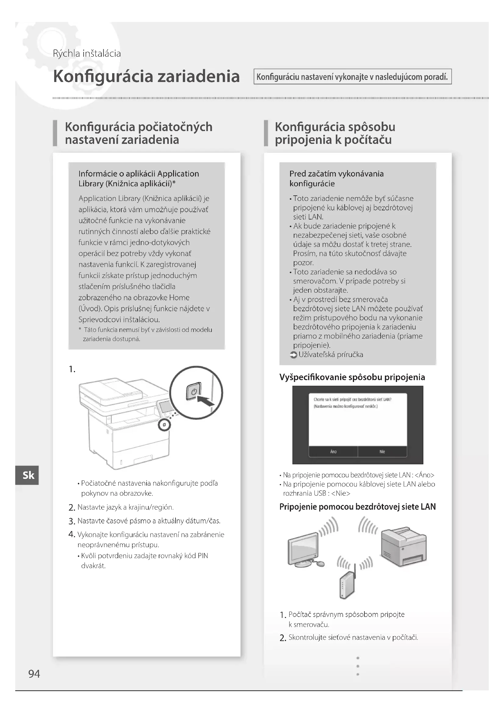 Kongurace nastavení faxu Rychlé nastavení CsKongurácia spôsobu pripojenia kpočítaču Informácie oaplikácii Application Library (Knižnica aplikácií)*Application Library (Knižnica aplikácií) je aplikácia, ktorá vám umožňuje používať užitočné funkcie na vykonávanie rutinných činností alebo ďalšie praktické funkcie v rámci jedno-dotykových operácií bez potreby vždy vykonať nastavenia funkcií. K zaregistrovanej funkcii získate prístup jednoduchým stlačením príslušného tlačidla zobrazeného na obrazovke Home (Úvod). Opis príslušnej funkcie nájdete v Sprievodcovi inštaláciou.* Táto funkcia nemusí byť vzávislosti od modelu zariadenia dostupná.