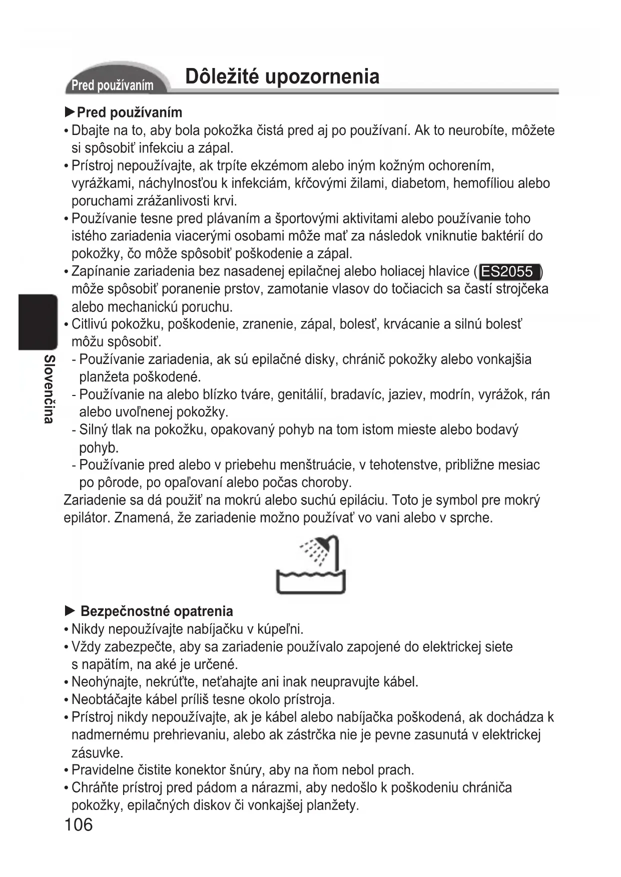 Tlačítko pro uvolnění rámu Příslušenství: Nabíječka (RE7- 44), čisticí kartáček a pouzdro (Nepoužívejte jiné než dodané příslušenství.)106 Slovenčina Dôležitéupozornenia Predpoužívaním 1Predpoužívaním Dbajte na to, aby bola pokožka čistá pred aj po používaní. Ak to neurobíte, môžete si spôsobiť infekciu a zápal. Prístroj nepoužívajte, ak trpíte ekzémom alebo iným kožným ochorením, vyrážkami, náchylnosťou k infekciám, kŕčovými žilami, diabetom, hemofíliou alebo poruchami zrážanlivosti krvi. Používanie tesne pred plávaním a športovými aktivitami alebo používanie toho istého zariadenia viacerými osobami môže mať za následok vniknutie baktérií do pokožky, čo môže spôsobiť poškodenie a zápal. Zapínanie zariadenia bez nasadenej epilačnej alebo holiacej hlavice ( ES2055