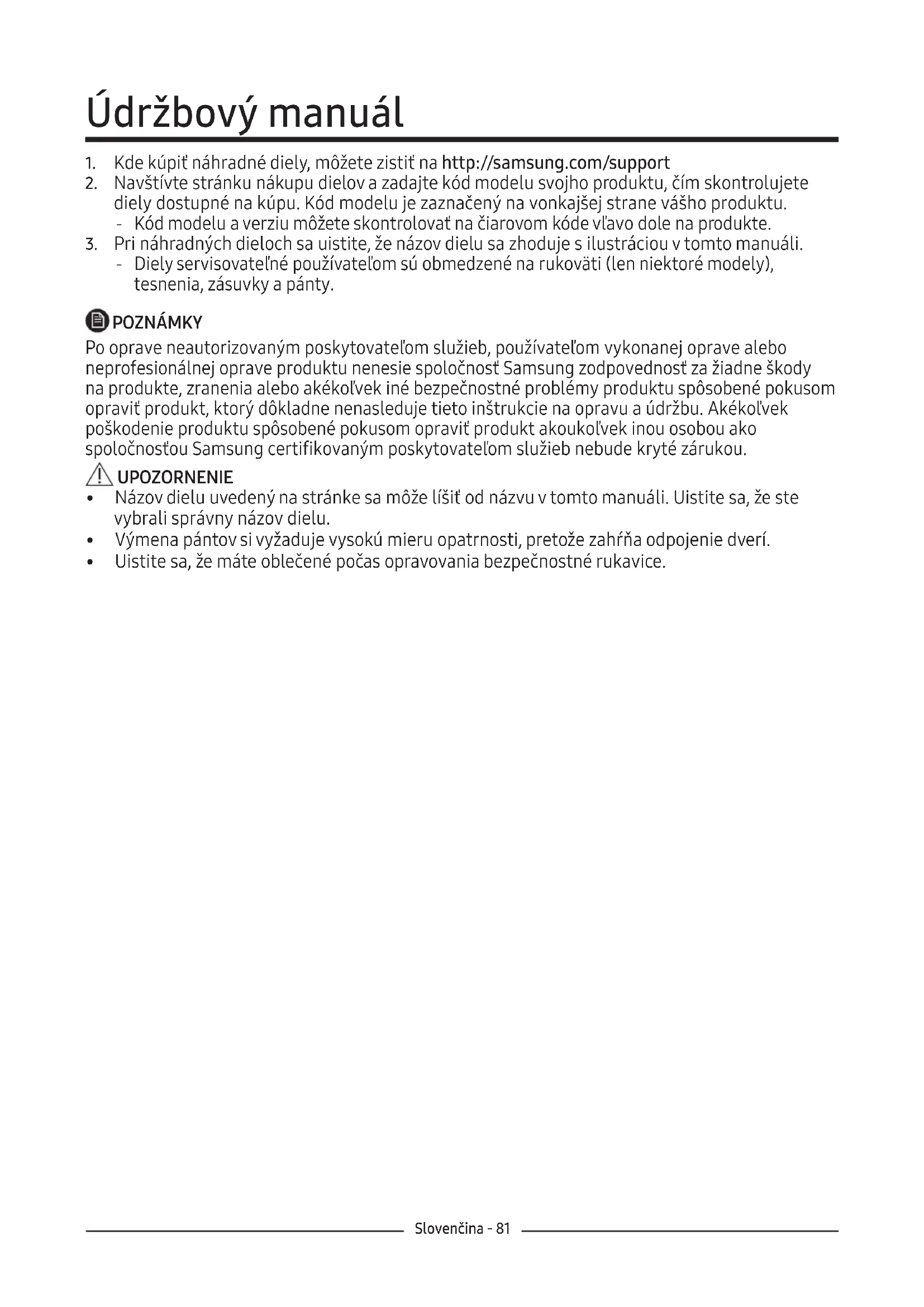 ‐ Diely servisovateľné používateľom sú obmedzené na rukoväti (len niektoré modely), tesnenia, zásuvky a pánty. POZNÁMKY Po oprave neautorizovaným poskytovateľom služieb, používateľom vykonanej oprave alebo neprofesionálnej oprave produktu nenesie spoločnosť Samsung zodpovednosť za žiadne škody naprodukte, zranenia alebo akékoľvek iné bezpečnostné problémy produktu spôsobené pokusom opraviť produkt, ktorý dôkladne nenasleduje tieto inštrukcie na opravu a údržbu. Akékoľvek poškodenie produktu spôsobené pokusom opraviť produkt akoukoľvek inou osobou ako spoločnosťou Samsung certifikovaným poskytovateľom služieb nebude kryté zárukou. UPOZORNENIE