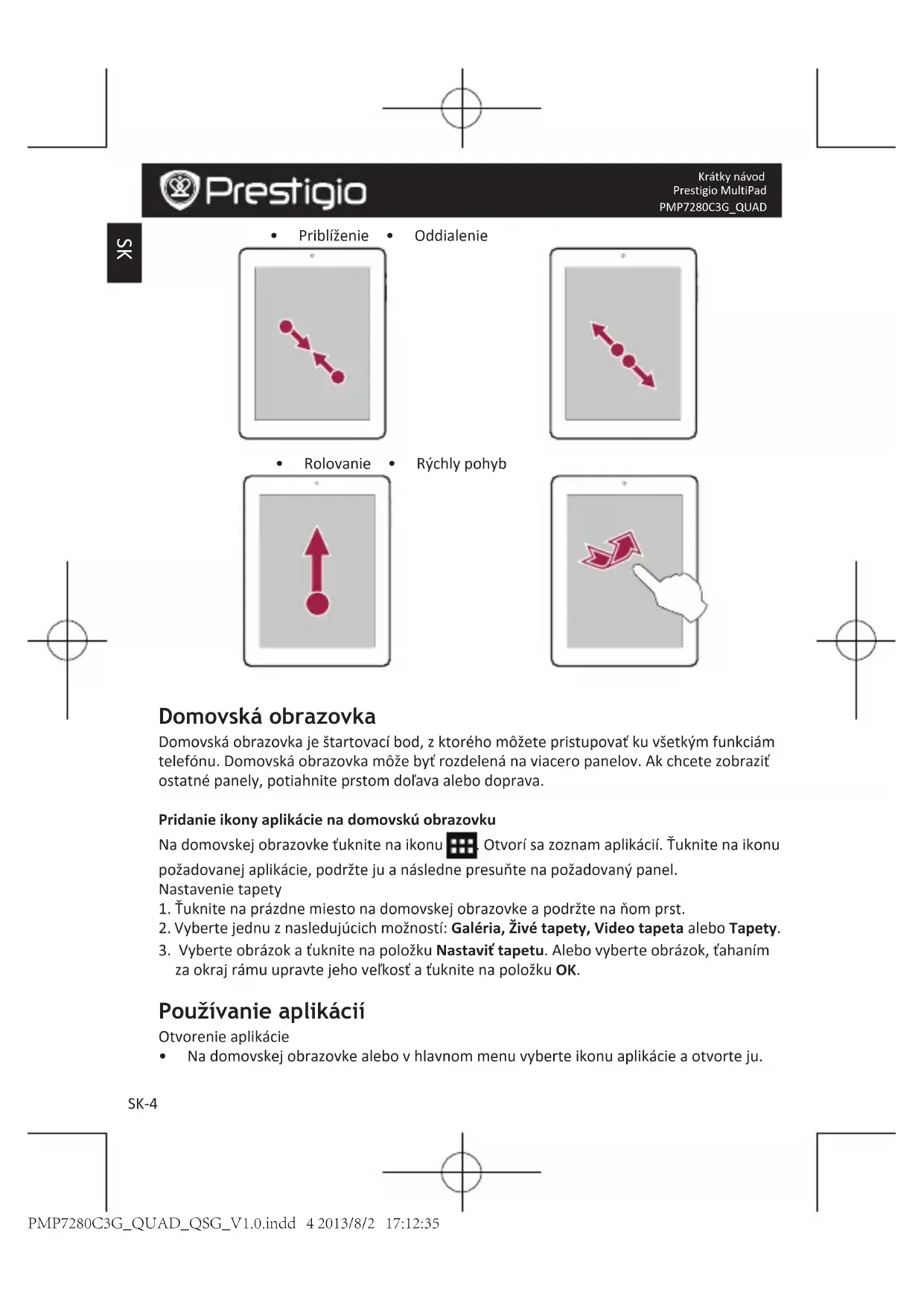 Konektory MicroUSB2.0,microSD(kompatibilnýsmicroSDHC) Komunikácia Wi-Fi(802.11b/g/n),3G(WCDMA) Bluetooth PodporaBluetooth3.0HighSpeed/BT4.0LowEnergy Kamera Predná0,3Mpix,zadná2,0Mpix Gsenzor Áno GPS Áno Podporované multimédiá Videá,zvukovésúbory,obrázky,elektronickéknihy Rozmery 204,25×157,2×9,6mm Váha 450g KeďževšetkyzariadeniaPrestigiosaneustáleaktualizujúavylepšujú,softvéra hardvérvášhozariadeniamôžemaťoprotipopisuvtomtokrátkomnávode mierneodlišnývzhľadaleboupravenéfunkcie. SpoločnosťPrestigiotýmtoprehlasuje,žetentoMultiPadvyhovujezákladnýmpožiadavkám aďalšímpríslušnýmpredpisompodľasmerniceEÚ1999/5/ES.Úplnéprehlásenieozhodeje dostupnénastránke: http://www.prestigio.com/compliance. Abynedošlokmožnémupoškodeniusluchu,nepočúvajtezvukdlhodoboprivysokej úrovnihlasitosti. PMP7280C3G_QUAD_QSG_V1.0.indd 6 2013/8/2 17:12:35S V-1
