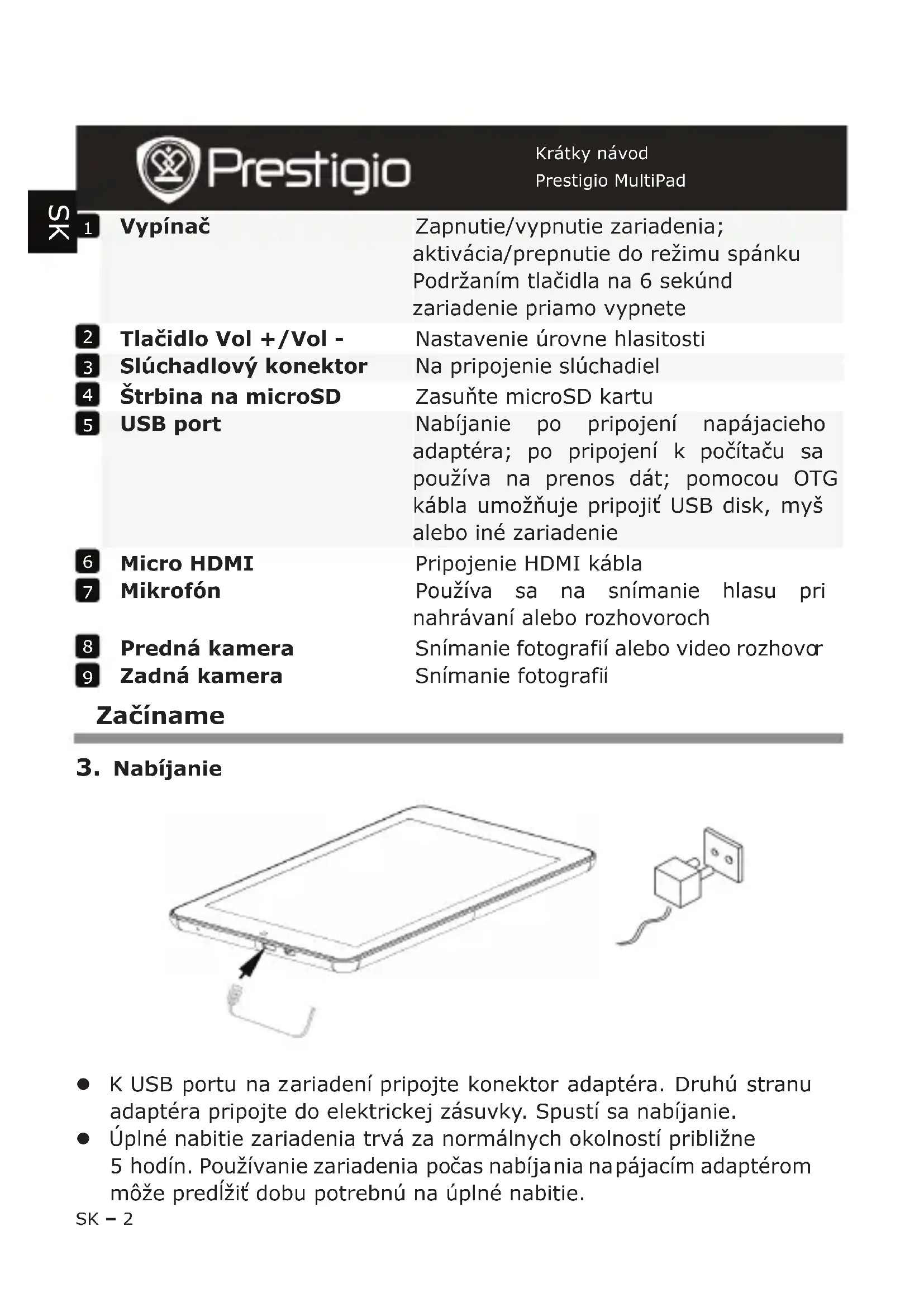 Keďže všetky zariadenia Prestigio sa neustále aktualizujú a vylepšujú, softvér a hardvér vášho zariadenia môže mať oproti popisu v tomto Krátkom návode mierne odlišný vzhľad alebo upravené funkcie. Spoločnosť Prestigio týmto prehlasuje, že tento MultiPad vyhovuje základným požiadavkám a ďalším príslušným predpisom podľa smernice EÚ 1999/5/ES. Úplné prehlásenie o zhode je dostupné na stránke http://www.prestigio.com/compliance