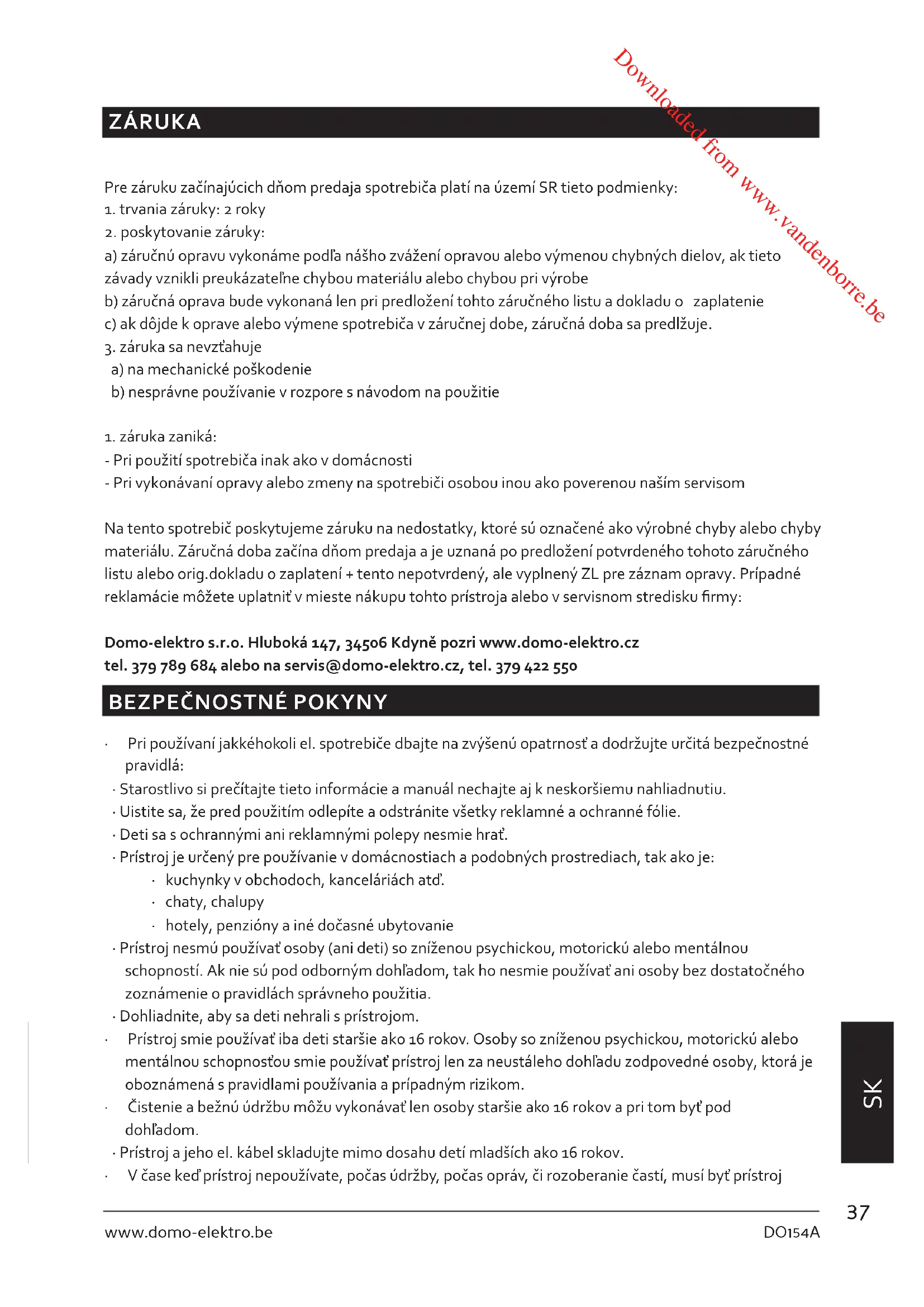 - Prístroj je vybavený kratším napájacím káblom, aby sa znížilo riziko zamotania sa do neho, alebo zakopnutia. Nepoužívajte predlžovacie káble. USCHOVAJTE SI TENTO NÁVOD NA NESKORŠIEMU NAHLIADNUTIU Downloaded from www.vandenborre.be39 DO154Awww.domo-elektro.be