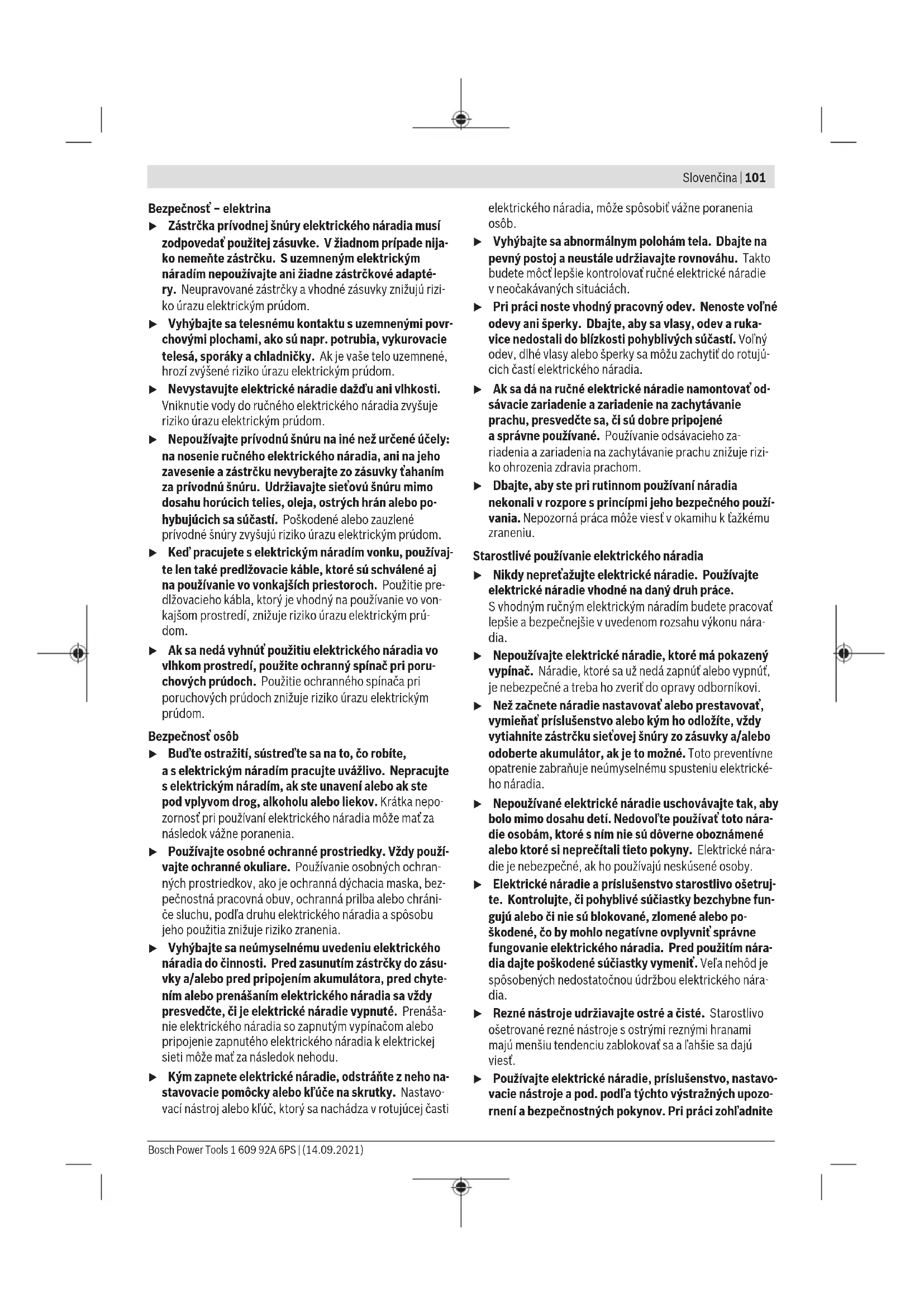 M6 2.71 3.61 4.52 4.8 5.42 6.02 7.22 8.13 9.7 13.6 16.2 M8 6.57 8.7 11 11.6 13.1 14.6 17.5 19.7 23 33 39 M10 13 17.5 22 23 26 29 35 39 47 65 78 M12 22.6 30 37.6 40 45 50 60 67 80 113 135 M14 36 48 60 65 72 79 95 107 130 180 215 M16 55 73 92 98 110 122 147 165 196 275 330 Tipy Před zašroubováním větších, delších šroubů do tvrdých materiálů byste měli předvrtat otvor sprůměrem jádra závitu do zhruba 2/3délky šroubu. Upozornění: Dbejte na to, aby se do elektrického nářadí nedostaly žádné drobné kovové díly. Upozornění pro optimální zacházení sakumulátorem Akumulátor chraňte před vlhkem avodou. Akumulátor skladujte pouze vteplotním rozmezí od −20°C do 50°C. Nenechávejte akumulátor ležet např. vlétě vautě. Výrazně kratší doba chodu po nabití ukazuje, že je akumulátor opotřebovaný amusí se vyměnit. Dodržujte pokyny pro likvidaci. Příležitostně vyčistěte větrací otvory apřípojky akumulátoru měkkým, čistým asuchým štětcem. Spona na pásek (viz obrázek E) Pomocí spony na pásek (17) můžete elektrické nářadí zavěsit např. na pásek. Pak máte obě ruce volné aelektrické nářadí je kdykoli po ruce. Barevná spona (viz obrázek F) Pomocí barevné spony (18) můžete elektrické nářadí individuálně označit. Bosch Power Tools 1 609 92A 6PS | (14.09.2021)100 | Slovenčina Údržba aservis Údržba ačištění u Čas od času vyčistěte upínání nástroje (1) azajišťovací objímku (2). u Pravidelně čistěte ventilační štěrbiny elektronářadí. Ventilátor motoru vtahuje do nářadí prach anahromadění velkého množství kovového prachu může způsobit elektrická rizika. u Před každou prací na elektronářadí (např. údržba, výměna nástrojů) apři jeho přepravě auskladnění vyjměte akumulátor. Při neúmyslném stisknutí vypínače hrozí nebezpečí poranění. u Udržujte elektronářadí avětrací otvory čisté, aby pracovalo dobře abezpečně. Zákaznická služba aporadenství ohledně použití Zákaznická služba zodpoví vaše dotazy kopravě aúdržbě vašeho výrobku atéž knáhradním dílům. Rozkladové výkresy ainformace onáhradních dílech najdete také na: www.bosch-pt.com Vpřípadě dotazů knašim výrobkům apříslušenství vám ochotně pomůže poradenský tým Bosch. Vpřípadě veškerých otázek aobjednávek náhradních dílů bezpodmínečně uveďte 10místné věcné číslo podle typového štítku výrobku. Czech Republic Robert Bosch odbytová s.r.o. Bosch Service Center PT K Vápence 1621/16 692 01 Mikulov Na www.bosch-pt.cz si si můžete objednat opravu Vašeho stroje nebo náhradní díly online. Tel.: +420 519 305700 Fax: +420 519 305705 E-Mail: servis.naradi@cz.bosch.com www.bosch-pt.cz Další adresy servisů najdete na: www.bosch-pt.com/serviceaddresses Přeprava Obsažené lithium-iontové akumulátory podléhají požadavkům zákona onebezpečných nákladech. Tyto akumulátory mohou být bez dalších podmínek přepravovány uživatelem po silnici. Při zasílání prostřednictvím třetí osoby (např.: letecká přeprava nebo spedice) je třeba brát zřetel na zvláštní požadavky na balení aoznačení. Zde musí být při přípravě zásilky nezbytně přizván expert na nebezpečné náklady. Akumulátory zasílejte pouze tehdy, pokud není poškozený kryt. Otevřené kontakty přelepte lepicí páskou aakumulátor zabalte tak, aby se vobalu nemohl pohybovat. Dodržujte také případné další národní předpisy. Likvidace Elektronářadí, akumulátory, příslušenství aobaly se musí odevzdat kekologické recyklaci. Elektronářadí aakumulátory/baterie nevyhazujte do domovního odpadu! Pouze pro zeměEU: Podle evropské směrnice 2012/19/EU se musí již nepoužitelné elektronářadí apodle evropské směrnice 2006/66/ES vadné nebo opotřebované akumulátory/ baterie shromažďovat odděleně aodevzdat kekologické recyklaci. Akumulátory/baterie: Lithium-iontové: Dodržujte pokyny uvedené včásti Přeprava (viz „Přeprava“, Stránka100). Slovenčina Bezpečnostné upozornenia Všeobecné bezpečnostné upozornenia pre elektrické náradie VÝSTRAHA Prečítajte si všetky bezpečnostné upozornenia, pokyny, ilustrácie ašpecifikácie dodané stýmto elektrickým náradím. Nedodržiavanie všetkých uvedených pokynov môže mať za následok úraz elektrickým prúdom, požiar a/alebo ťažké poranenie. Tieto výstražné upozornenia abezpečnostné pokyny starostlivo uschovajte na budúce použitie. Pojem „elektrické náradie“ používaný vnasledujúcom texte sa vzťahuje na elektrické náradie napájané zo siete (sprívod- nou šnúrou) ana elektrické náradie napájané akumulátoro- vou batériou (bez prívodnej šnúry). Bezpečnosť na pracovisku u Pracovisko vždy udržiavajte čisté adobre osvetlené. Neporiadok aneosvetlené priestory pracoviska môžu mať za následok pracovné úrazy. u Nepoužívajte elektrické náradie vo výbušnom pro- stredí, napr. tam, kde sa nachádzajú horľavé kvapali- ny, plyny alebo horľavý prach. Ručné elektrické náradie vytvára iskry, ktoré by mohli zapáliť prach alebo výpary. u Nedovoľte deťom ainým nepovolaným osobám, aby sa počas používania elektrického náradia zdržiavali vblízkosti pracoviska. Pri rozptyľovaní môžete stratiť kontrolu nad náradím. 1 609 92A 6PS | (14.09.2021) Bosch Power ToolsSlovenčina | 101 Bezpečnosť – elektrina u Zástrčka prívodnej šnúry elektrického náradia musí zodpovedať použitej zásuvke. Vžiadnom prípade nija- ko nemeňte zástrčku. Suzemneným elektrickým náradím nepoužívajte ani žiadne zástrčkové adapté- ry. Neupravované zástrčky avhodné zásuvky znižujú rizi- ko úrazu elektrickým prúdom. u Vyhýbajte sa telesnému kontaktu suzemnenými povr- chovými plochami, ako sú napr. potrubia, vykurovacie telesá, sporáky achlad