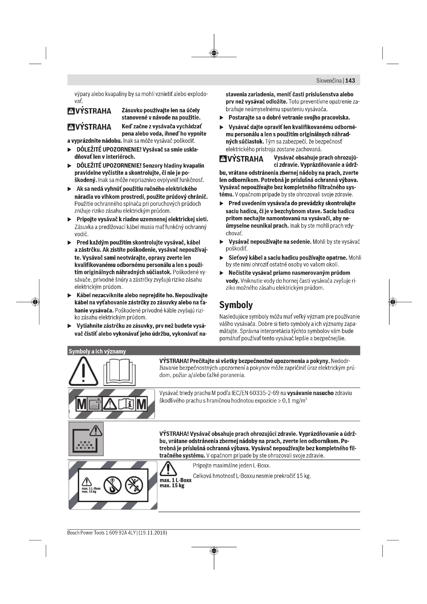 VÝSTRAHA! Vysávač obsahuje prach ohrozujúci zdravie. Vyprázdňovanie aúdrž- bu, vrátane odstránenia zbernej nádoby na prach, zverte len odborníkom. Po- trebná je príslušná ochranná výbava. Vysávač nepoužívajte bez kompletného fil- tračného systému. Vopačnom prípade by ste ohrozovali svoje zdravie. Pripojte maximálne jeden L-Boxx. Celková hmotnosť L-Boxxu nesmie prekročiť 15kg. Slovenčina | 143 Bosch Power Tools 1 609 92A 4LY | (19.11.2018)144 | Slovenčina 1 609 92A 4LY | (19.11.2018) Bosch Power Tools Symboly aich významy Vysávač neprepravujte zavesený na hák žeriava. Vysávač sa nesmie prepravovať žeriavom. Hrozí riziko poranenia apoškodenia. Vysávač nepoužívajte na sedenie, ako rebrík alebo stúpadlo. Vysá- vač sa môže prevrátiť apoškodiť. Hrozí riziko poranenia. Automatika štart/stop Odsávanie vznikajúceho prachu zbežiaceho elektrického náradia Vysávač sa automaticky zapne asčasovým oneskorením vypne Vypnutie Vysávanie Vysávanie usadeného prachu