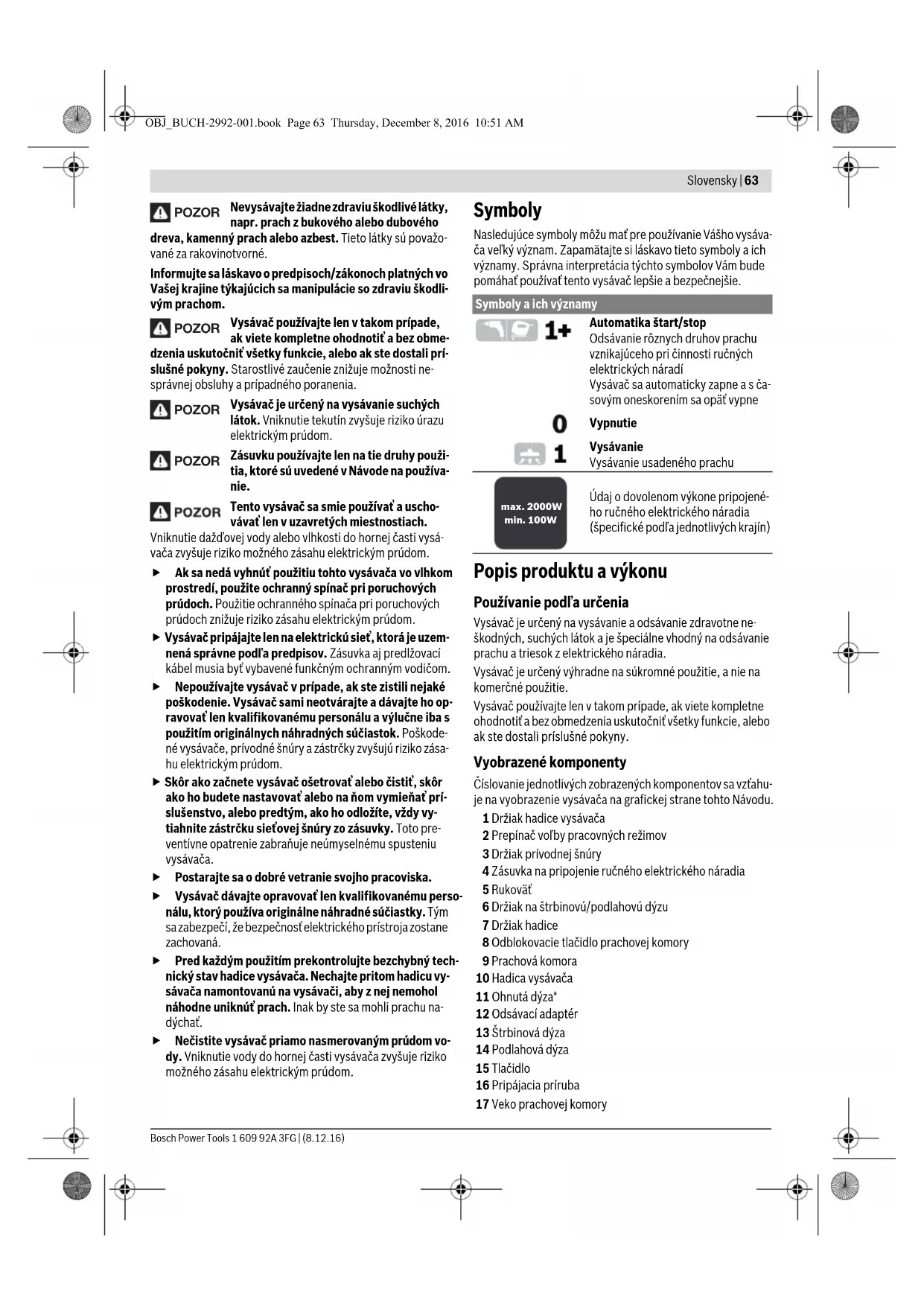 Dodržiavajte maximálny dovolený výkon pripojeného ručné- ho elektrického náradia. – Namontujte odsávací adaptér 12 (pozri „Montáž odsáva- cieho adaptéra alebo ohnutej dýzy“, strana 65). – Zasuňte saciu hadicu 12 do odsávacieho hrdla elektrické- ho náradia. Upozornenie: Pri práci s elektrickým náradím, ktorého prí- vod vzduchu do sacej hadice je nízky (napríklad priamočiare píly, brúsky a podobne), musí byť otvorený otvor pre falošný vzduch 20 sacej hadice 10. Tým sa zlepší celkový výkon vysá- vača a elektrického náradia. Na vykonanie tohto úkonu otáčajte prstenec nad otvorom pre falošný vzduch 20, až kým nevznikne maximálny otvor. –Na zapnutie vysávača zapnite ručné elektrické náradie pri- pojené do zásuvky 4 vysávača. Vysávač sa automaticky spustí. – Vypnite ručné elektrické náradie, keď chcete vysávanie skončiť. Dobehová funkcia automatiky štart/stop ešte 6 sekúnd do- bieha, aby sa z odsávacej hadice vysal zvyšok prachu. Údržba a servis Údržba a čistenie Pred každou prácou na vysávači vytiahnite zástrčku sieťovej šnúry zo zásuvky. Vysávač a jeho vetracie štrbiny udržiavajte vždy v čis- tote, aby ste mohli pracovať kvalitne a bezpečne. Ak je potrebná výmena prívodnej šnúry, musí ju vykonať firma Bosch alebo niektoré autorizované servisné stredisko ručné- ho elektrického náradia Bosch, aby sa zabránilo ohrozeniu bezpečnosti používateľa náradia. Čistenie filtračnej jednotky (pozri obrázky E1–E3) – Stlačte odblokovacie tlačidlo 8 a vytiahnite prachovú ko- moru 9 z vysávača. – Vyberte tkanivový filter 21 spolu s filtračným košom a tkanivový filter mäkkou kefkou vykefujte. – Chyťte plochý skladaný filter 22 za výstuž a vyberte ho spolu s filtračným košom. Plochý skladaný filter vyčistite mäkkou kefkou alebo ho opláchnite pod tečúcou vodou a následne ho nechajte dobre vyschnúť. – Vyčistený filter znova vložte a dbajte pritom na bezpečné a správne umiestnenie. Čistenie prachovej komory – Prachovú komoru 9 občas vytrite bežným, neabrazívnym čistiacim prostriedkom a potom ju nechajte dôkladne vy- schnúť. Čistenie permanentného filtra (pozri obrázok F) Permanentný filter 24 občas vyčistite, aby sa zachovala opti- málna výkonnosť vysávača. – Otvorte kryt s odvodom vzduchu 23 a vyberte permanent- ný filter 24. – Permanentný filter 24 vyčistite pod tečúcou vodou a následne ho nechajte dobre vyschnúť. – Vyčistený filter znova vložte a dbajte pritom na bezpečné a správne umiestnenie. Opäť uzatvorte kryt s odvodom vzduchu. Poruchy Ak je vysávací výkon nedostatočný, skontrolujte: – Nie je hadicový systém vysávača upchatý? –Sú filtre zanesené prachom? –Je prachová komora 9 plná? –Je vrecko na prach 18 plné? V prípade prehriatia sa vysávač vypne. Postupujte takto: – Nechajte vysávač 60 min vychladnúť. – Vytiahnite sieťovú zástrčku zo zásuvky a znova ju zasuňte do zásuvky. – Zabezpečte, aby nádoba 9 avrecko na prach 18 boli prázdne a aby sacia hadica 10, filter 21/22 a permanentný filter 24 neboli upchaté. Pravidelné vyprázdňovanie zabezpečuje optimálny vysávací výkon. Ak sa ani potom nedosiahne dobrý vysávací výkon, treba vy- sávač zveriť do opravy autorizovanému servisnému stredisku Bosch. Skladovanie (pozri obrázok G) – Dajte dolu elastické popruhy držiaka sacej hadice 1 asaciu hadicu 10 položte okolo vysávača. Elastické popruhy znova založte. – Vsuňte sacie príslušenstvo do pripraveného držiaka 6 na vysávači. – Sieťovú šnúru namotajte na držiak šnúry 3. – Vysávač prenášajte iba za rukoväť 5