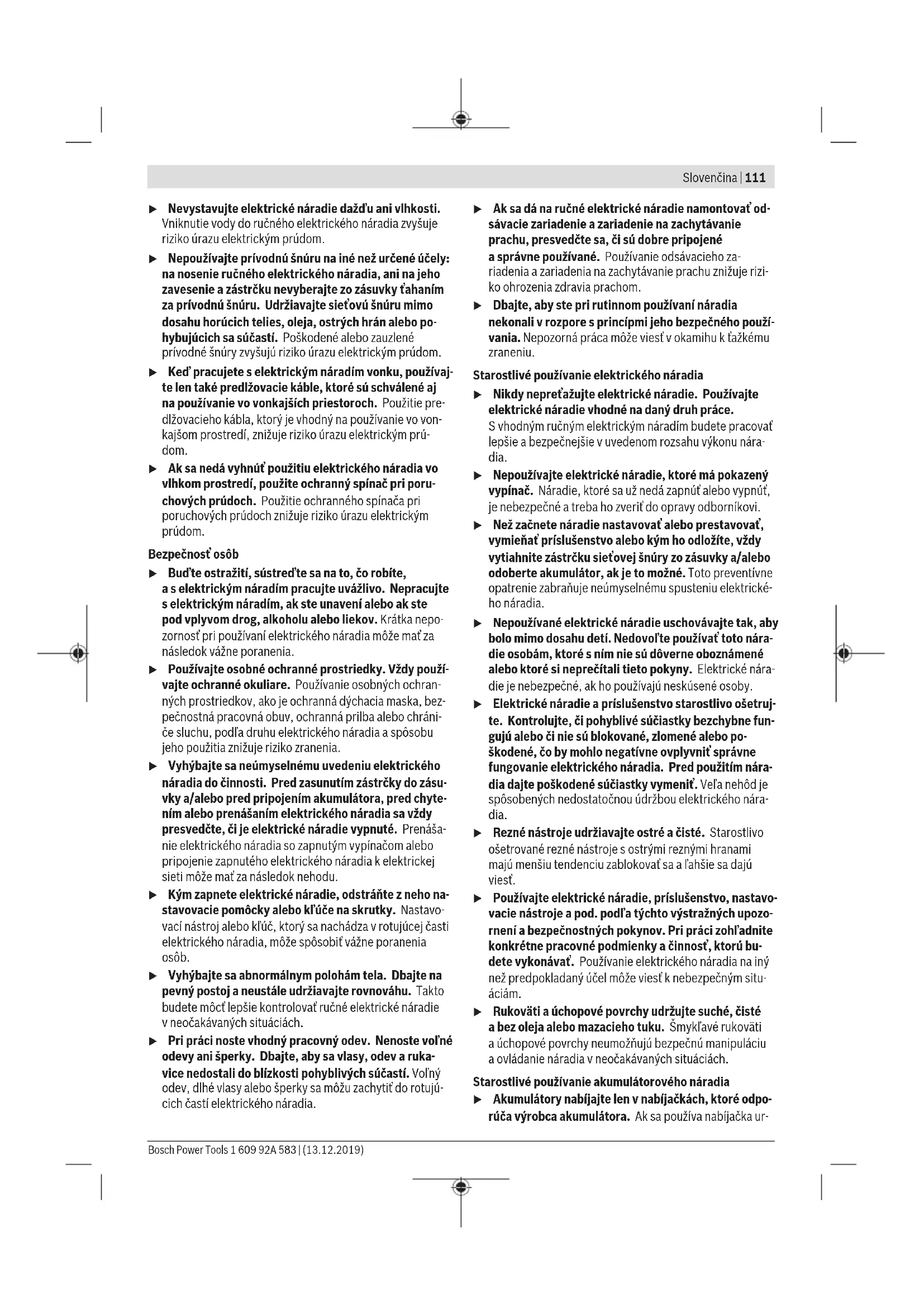 Rozsah vysokých otáček; pro práce smalým průměrem vrtání. u Přepínač stupňů posuňte vždy až nadoraz. Jinak se může elektronářadí poškodit. Doběhová brzda Při uvolnění vypínače (11) se sklíčidlo přibrzdí, atím se zabrání doběhu nástroje. Při zašroubovávání šroubů uvolněte vypínač (11) teprve tehdy, když je šroub vrovině zašroubovaný do obrobku. Hlava šroubu pak nepronikne do obrobku. Ochrana proti přetížení závislá na teplotě Pokud se nářadí používá vsouladu surčeným účelem, nemůže dojít kjeho přetížení. Při příliš velkém zatížení nebo překročení přípustného rozsahu provozní teploty se sníží otáčky. Elektronářadí se na plné otáčky znovu rozeběhne až po dosažení přípustné provozní teploty. Plně automatická aretace vřetena (Auto-Lock) Když není stisknutý vypínač (11)je vřeteno atedy upínání nástroje (1) zaaretované. To umožňuje zašroubování šroubů ipři vybitém akumulátoru (7), popř. použití elektrického nářadí jako šroubováku. Pracovní pokyny u Elektronářadí nasazujte na matici/šroub pouze vypnuté. Otáčející se nástroje mohou sklouznout. Po delší práci snízkými otáčkami byste měli elektrické nářadí kvůli ochlazení nechat cca 3minuty běžet naprázdno smaximálními otáčkami. Pro vrtání do dlaždice nastavte přepínač na symbol „vrtání“. Po provrtání dlaždice nastavte přepínač na symbol „příklepové vrtání“ apracujte spříklepem. Při práci vbetonu, kameni azdivu použijte vrtáky ztvrdokovu. Při vrtání do kovu používejte pouze bezvadné, ostré vrtáky HSS (HSS = vysoce výkonná rychlořezná ocel). Odpovídající kvalitu zaručuje program příslušenství Bosch. Před zašroubováním větších, delších šroubů do tvrdých materiálů byste měli předvrtat otvor sprůměrem jádra závitu do zhruba 2/3délky šroubu. Pro odstranění šroubovacího bitu nebo univerzálního držáku bitů se smí použít pomocný nástroj. Držák bitů (viz obrázek D1) Do magnetického držáku bitů lze nasadit šroubovací bity za účelem uložení. Spona na pásek (viz obrázek D2) Pomocí spony na pásek (6) můžete elektronářadí zavěsit např. na pásek. Pak máte obě ruce volné aelektronářadí je kdykoli po ruce. Bosch Power Tools 1 609 92A 583 | (13.12.2019)110 | Slovenčina Údržba aservis Údržba ačištění u Před každou prací na elektronářadí (např. údržba, výměna nástrojů) apři jeho přepravě auskladnění vyjměte akumulátor. Při neúmyslném stisknutí vypínače hrozí nebezpečí poranění. u Udržujte elektronářadí avětrací otvory čisté, aby pracovalo dobře abezpečně. Zákaznická služba aporadenství ohledně použití Zákaznická služba zodpoví vaše dotazy kopravě aúdržbě vašeho výrobku atéž knáhradním dílům. Rozkladové výkresy ainformace onáhradních dílech najdete také na: www.bosch-pt.com. Vpřípadě dotazů knašim výrobkům apříslušenství vám ochotně pomůže poradenský tým Bosch. Vpřípadě veškerých otázek aobjednávek náhradních dílů bezpodmínečně uveďte 10místné věcné číslo podle typového štítku výrobku. Czech Republic Robert Bosch odbytová s.r.o. Bosch Service Center PT K Vápence 1621/16 692 01 Mikulov Na www.bosch-pt.cz si si můžete objednat opravu Vašeho stroje nebo náhradní díly online. Tel.: +420 519 305700 Fax: +420 519 305705 E-Mail: servis.naradi@cz.bosch.com www.bosch-pt.cz Přeprava Obsažené lithium-iontové akumulátory podléhají požadavkům zákona onebezpečných nákladech. Tyto akumulátory mohou být bez dalších podmínek přepravovány uživatelem po silnici. Při zasílání prostřednictvím třetí osoby (např.: letecká přeprava nebo spedice) je třeba brát zřetel na zvláštní požadavky na balení aoznačení. Zde musí být při přípravě zásilky nezbytně přizván expert na nebezpečné náklady. Akumulátory zasílejte pouze tehdy, pokud není poškozený kryt. Otevřené kontakty přelepte lepicí páskou aakumulátor zabalte tak, aby se vobalu nemohl pohybovat. Dodržujte také případné další národní předpisy. Likvidace Elektronářadí, akumulátory, příslušenství a obaly se musí odevzdat k ekologické recyklaci. Elektronářadí a akumulátory/baterie nevyhazujte do domovního odpadu! Pouze pro zeměEU: Podle evropské směrnice 2012/19/EU se musí již nepoužitelné elektronářadí apodle evropské směrnice 2006/66/ES vadné nebo opotřebované akumulátory/ baterie shromažďovat odděleně aodevzdat kekologické recyklaci. Akumulátory/baterie: Lithium-iontové: Dodržujte pokyny uvedené včásti Přeprava (viz „Přeprava“, Stránka110). Slovenčina Bezpečnostné upozornenia Všeobecné bezpečnostné upozornenia pre elektrické náradie VÝSTRAHA Prečítajte si všetky bezpečnostné upozornenia, pokyny, ilustrácie ašpecifikácie dodané stýmto elektrickým náradím. Nedodržiavanie všetkých uvedených pokynov môže mať za následok úraz elektrickým prúdom, požiar a/alebo ťažké poranenie. Tieto výstražné upozornenia abezpečnostné pokyny starostlivo uschovajte na budúce použitie. Pojem „elektrické náradie“ používaný vnasledujúcom texte sa vzťahuje na elektrické náradie napájané zo siete (sprívod- nou šnúrou) ana elektrické náradie napájané akumulátoro- vou batériou (bez prívodnej šnúry). Bezpečnosť na pracovisku u Pracovisko vždy udržiavajte čisté adobre osvetlené. Neporiadok aneosvetlené priestory pracoviska môžu mať za následok pracovné úrazy. u Nepoužívajte elektrické náradie vo výbušnom pro- stredí, napr. tam, kde sa nachádzajú horľavé kvapali- ny, plyny alebo horľavý prach. Ručné elektrické náradie vytvára iskry, ktoré by mohli zapáliť prach alebo výpary. u Nedovoľte deťom ainým nepovolaným osobám, aby