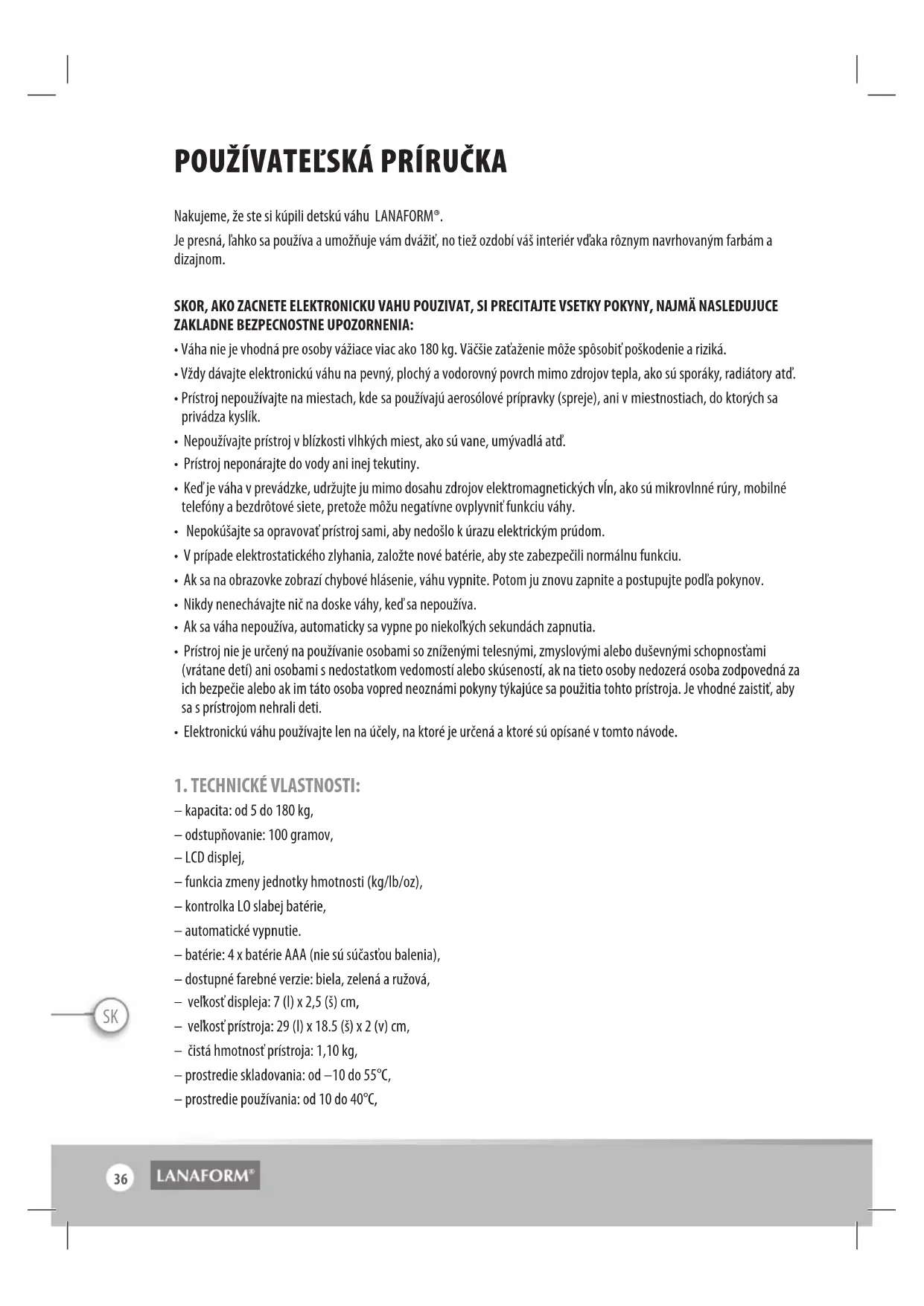 Nakujeme, že ste si kúpili detskú váhu LANAFORM®. Je presná, ľahko sa používa a umožňuje vám dvážiť, no tiež ozdobí váš interiér vďaka rôznym navrhovaným farbám a dizajnom. SKOR, AKO ZACNETE ELEKTRONICKU VAHU POUZIVAT, SI PRECITAJTE VSETKY POKYNY, NAJMÄ NASLEDUJUCE ZAKLADNE BEZPECNOSTNE UPOZORNENIA: