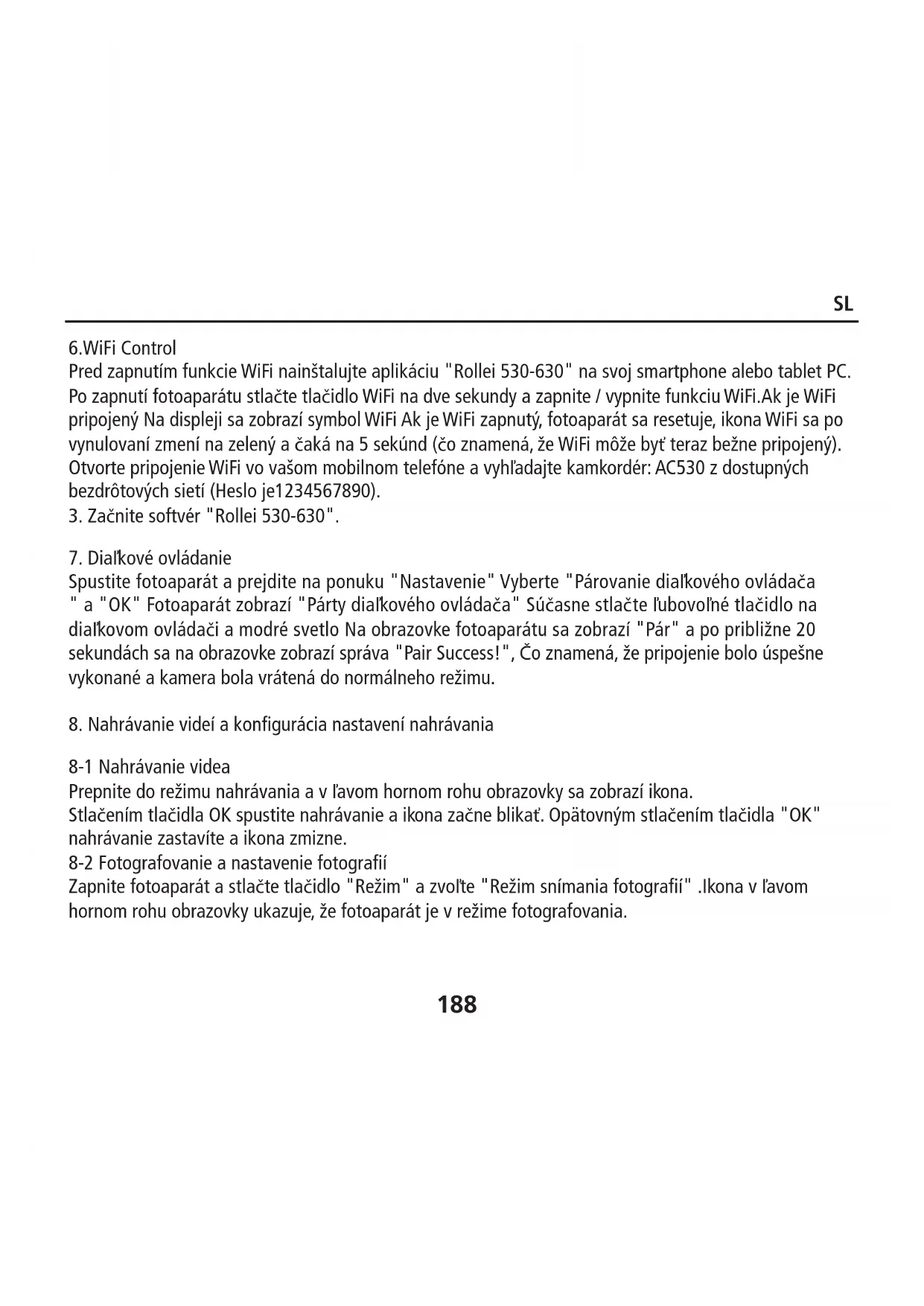 6.WiFi Control Pred zapnutím funkcie WiFi nainštalujte aplikáciu "Rollei 530-630" na svoj smartphone alebo tablet PC. Po zapnutí fotoaparátu stlačte tlačidlo WiFi na dve sekundy a zapnite / vypnite funkciu WiFi.Ak je WiFi pripojený Na displeji sa zobrazí symbol WiFi Ak je WiFi zapnutý, fotoaparát sa resetuje, ikona WiFi sa po vynulovaní zmení na zelený a čaká na 5 sekúnd (čo znamená, že WiFi môže byť teraz bežne pripojený). Otvorte pripojenie WiFi vo vašom mobilnom telefóne a vyhľadajte kamkordér: AC530 z dostupných bezdrôtových sietí (Heslo je1234567890).