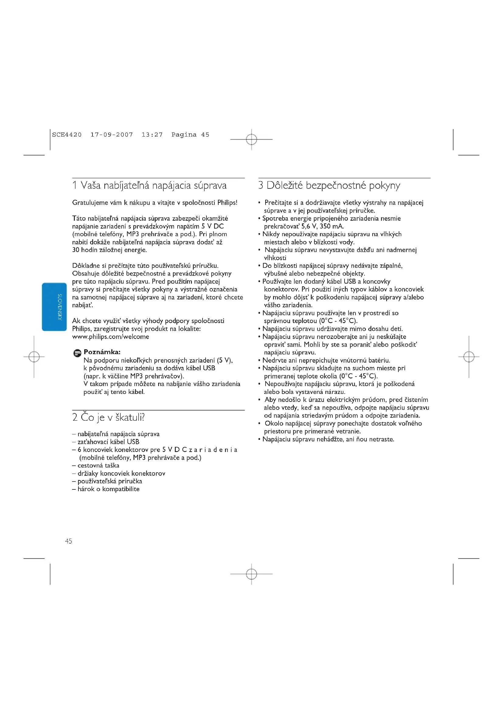 - Při vzniku problémů s napájecím packem nebo příslušenstvím vezměte napájecí pack a příslušenství ke svému místnímu prodejci. 9 Potřebujete pomoc? Podpora online: www.philips.com/welcome Interaktivní pomoc a často kladené otázky. SCE4420 17-09-2007 13:27 Pagina 4445 SLOVENSKY 1 Vaša nabíjateľná napájacia súprava Gratulujeme vám k nákupu a vitajte v spoločnosti Philips! Táto nabíjateľná napájacia súprava zabezpečí okamžité napájanie zariadení s prevádzkovým napätím 5 V DC (mobilné telefóny, MP3 prehrávače a pod.). Pri plnom nabití dokáže nabíjateľná napájacia súprava dodať až 30 hodín záložnej energie. Dôkladne si prečítajte túto používateľskú príručku. Obsahuje dôležité bezpečnostné a prevádzkové pokyny pre túto napájaciu súpravu. Pred použitím napájacej súpravy si prečítajte všetky pokyny a výstražné označenia na samotnej napájacej súprave aj na zariadení, ktoré chcete nabíjať. Ak chcete využiť všetky výhody podpory spoločnosti Philips, zaregistrujte svoj produkt na lokalite: www.philips.com/welcome Poznámka: Na podporu niekoľkých prenosných zariadení (5 V), k pôvodnému zariadeniu sa dodáva kábel USB (napr. k väčšine MP3 prehrávačov). V takom prípade môžete na nabíjanie vášho zariadenia použiť aj tento kábel. 2 Čo je v škatuli? – nabíjateľná napájacia súprava – zaťahovací kábel USB – 6 koncoviek konektorov pre5VDCzariadenia (mobilné telefóny, MP3 prehrávače a pod.) – cestovná taška – držiaky koncoviek konektorov – používateľská príručka – hárok o kompatibilite 3 Dôležité bezpečnostné pokyny