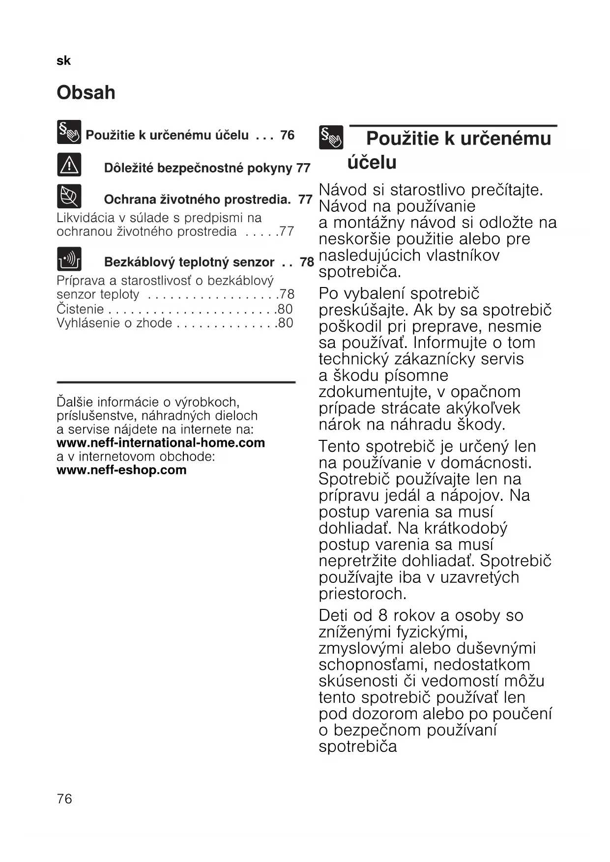 - Obsah skNávod na používanie 8 Použitie k určenému účelu p. 76