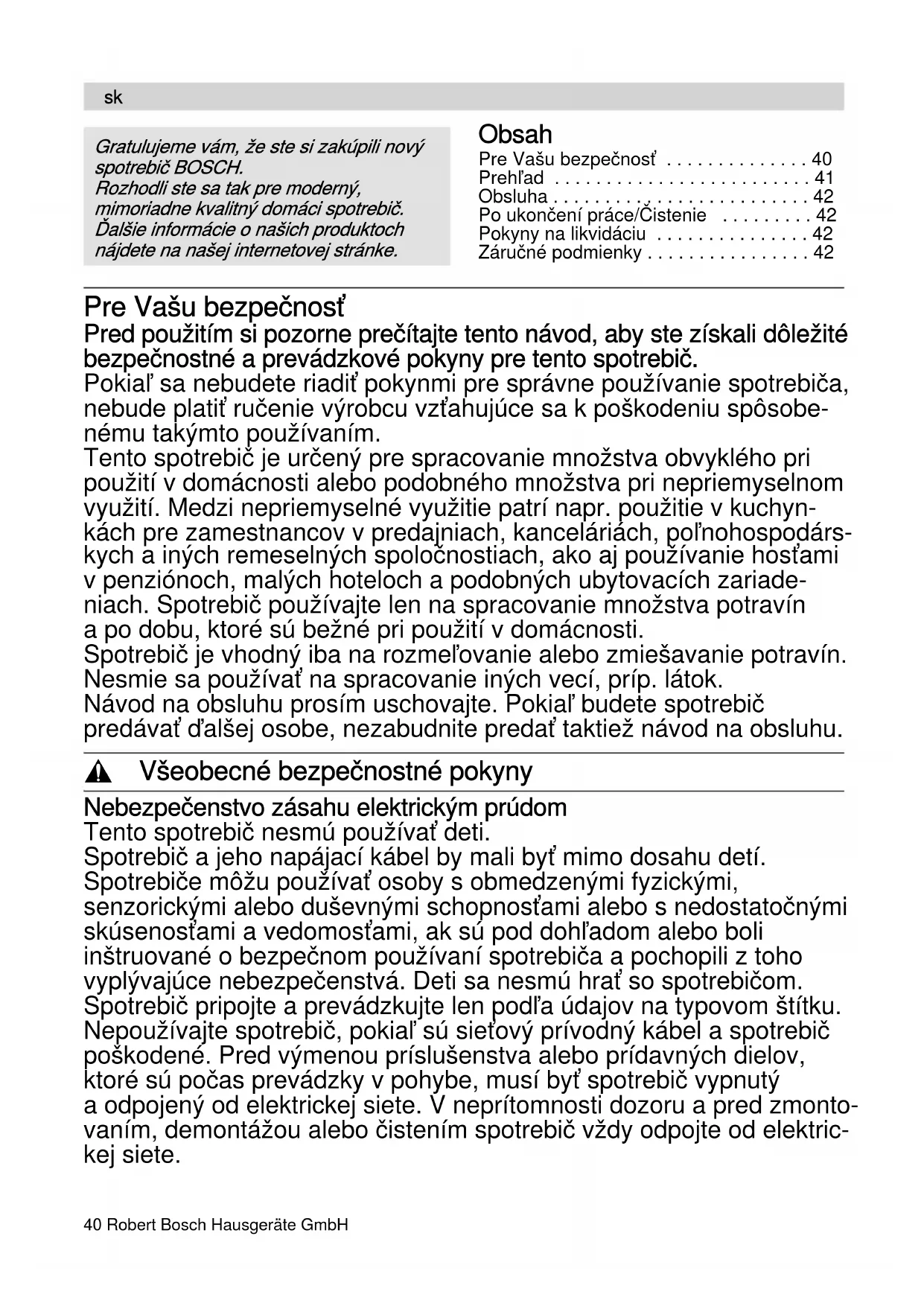 - Změny vyhrazeny.40 Robert Bosch Hausgeräte GmbH Obsah Pre Vašu bezpečnosť p. 40