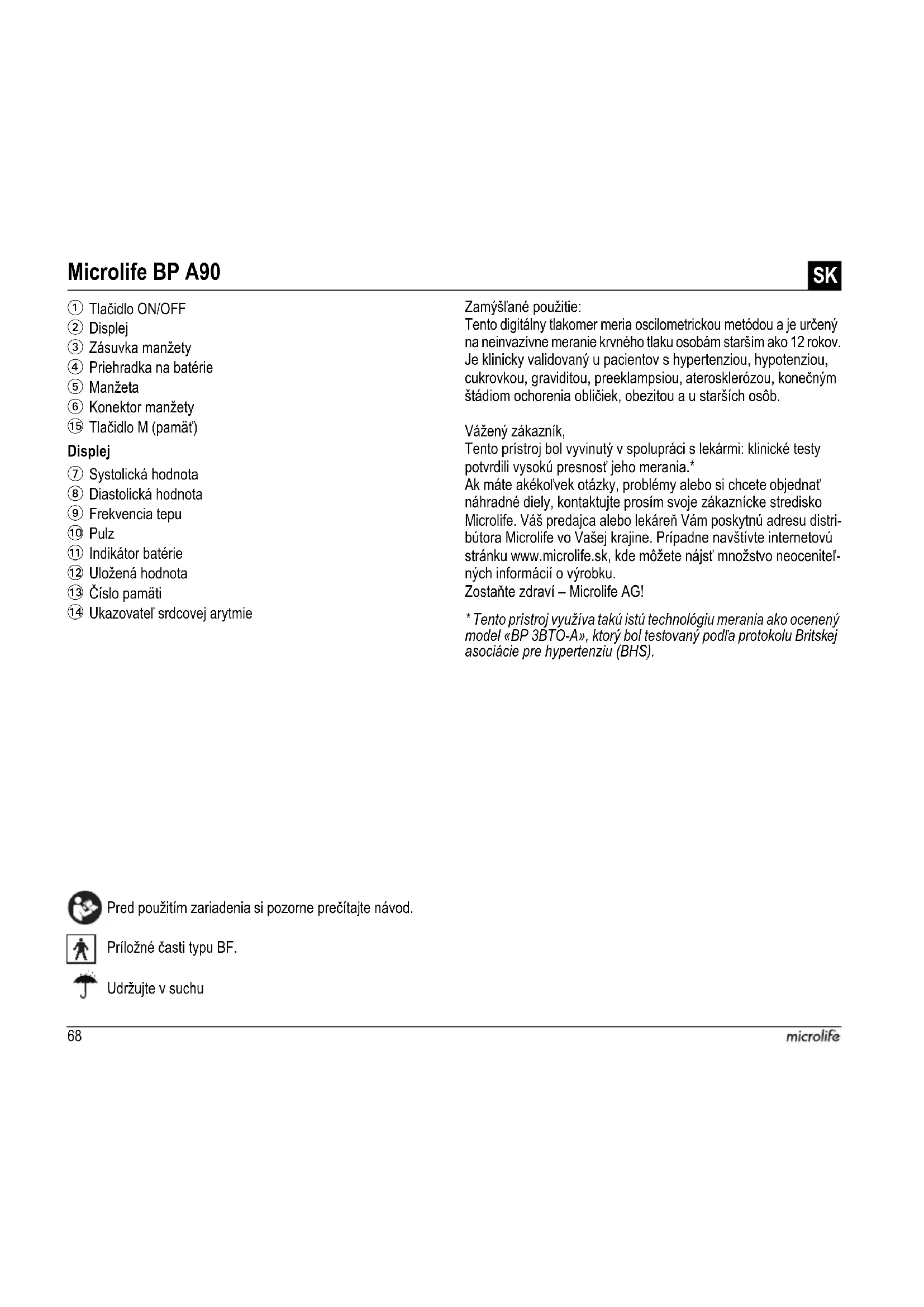 - Tento prístroj využíva takú istú technológiu merania ako ocenený model «BP 3BTO-A», ktorý bol testovaný podľa protokolu Britskej asociácie pre hypertenziu (BHS). Microlife BP A90