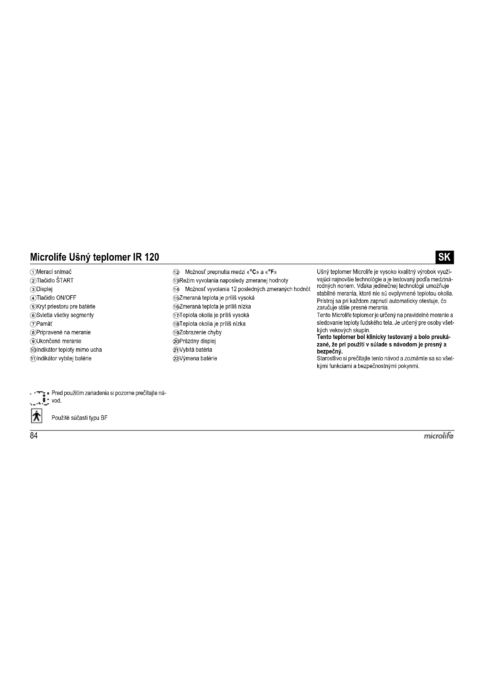 Pred použitím zariadenia si pozorne prečítajte ná- vod. Použité súčasti typu BF Ušný teplomer Microlife je vysoko kvalitný výrobok využí- vajúci najnovšie technológie a je testovaný podľa medziná- rodných noriem. Vďaka jedinečnej technológii umožňuje stabilné merania, ktoré nie sú ovplyvnené teplotou okolia. Prístroj sa pri každom zapnutí automaticky otestuje, čo zaručuje stále presné merania. Tento Microlife teplomer je určený na pravidelné meranie a sledovanie teploty ľudského tela. Je určený pre osoby všet- kých vekových skupín. Tento teplomer bol klinicky testovaný a bolo preuká- zané, že pri použití v súlade s návodom je presný a bezpečný. Starostlivo si prečítajte tento návod a zoznámte sa so všet- kými funkciami a bezpečnostnými pokynmi. Microlife Ušný teplomer IR 120