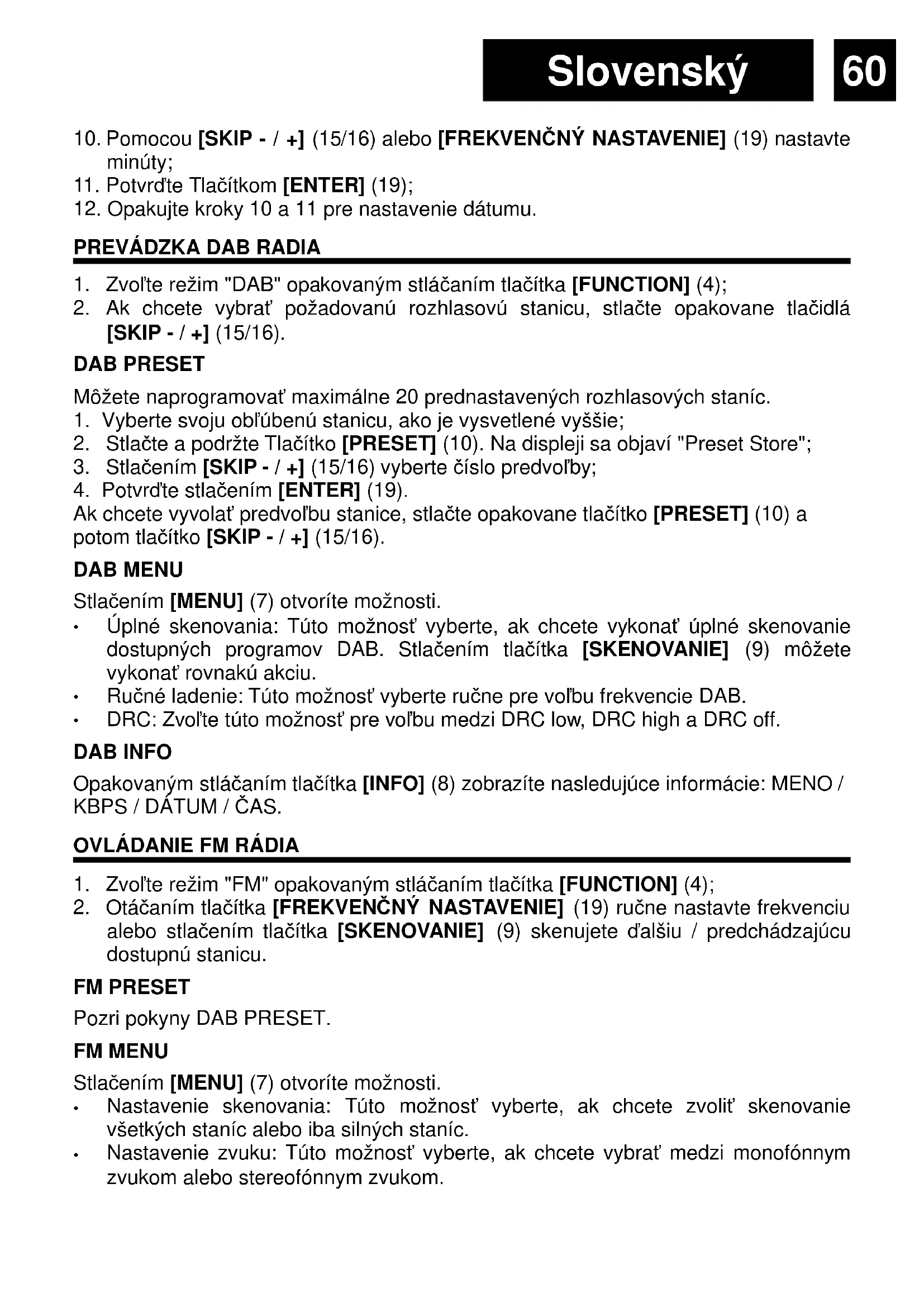 [SKIP - / +] (15/16). DAB PRESET Môžete naprogramovať maximálne 20 prednastavených rozhlasových staníc.