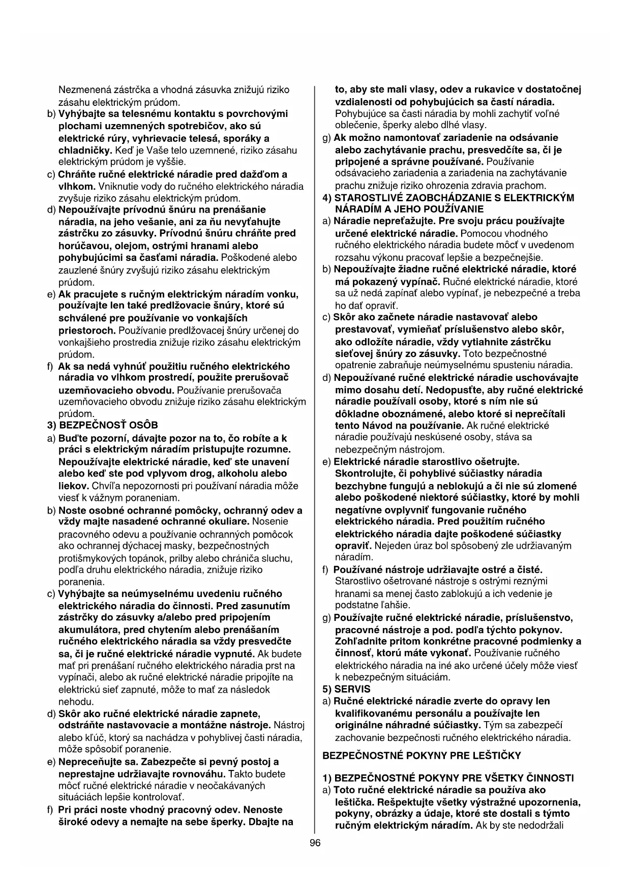 d) Nepoužívané ručné elektrické náradie uschovávajte mimo dosahu detí. Nedopustře, aby ručné elektrické náradie používali osoby, ktoré s nim nie su dōkladne oboznámene, alebo ktoré si neprecítili tento Návod na používanie. Ak ručné elektrické náradie používajú neskúsené osoby, stáva sa nebezpečným nastrojom.