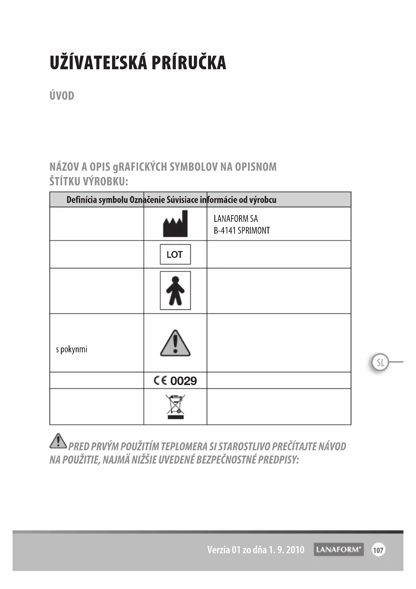 Verze 01 ze dne 1. 9. 2010SL užívateľská príručka ÚVOD Ďakujeme vám, že ste si kúpili „TEPLOMER 4 v 1“ od spoločnosti LANAFORM®.Tento ušný a čelový teplomer od spoločnosti LANAFORM realizuje presné meranie teploty vďaka infračervenej technológii, ktorou je toto zariadenie vybavené. NÁZOV A OPIS gRAFICKÝCH SYMBOLOV NA OPISNOM ŠTÍTKU VÝROBKU: Definícia symbolu Označenie Súvisiace informácie od výrobcuÚdaje o výrobcoviLANAFORM SAB-4141 SPRIMONTČíslo šarže LOT Zariadenie typu BFPozor, pozri poznámka s pokynmiPozor, odkazujeme vás na priložené dokumenty. Pred prvým použitím si pozorne prečítajte nasledujúce pokyny. Tieto pokyny je treba dodržiavať aj pri každom ďalšom použití.Notifikovaný orgán Odpad z elektrických a elektronických zariadení (OEEZ) PRED PRVÝM POUŽITÍM TEPLOMERA SI STAROSTLIVO PREČÍTAJTE NÁVOD NA POUŽITIE, NAJMÄ NIŽŠIE UVEDENÉ BEZPEČNOSTNÉ PREDPISY: