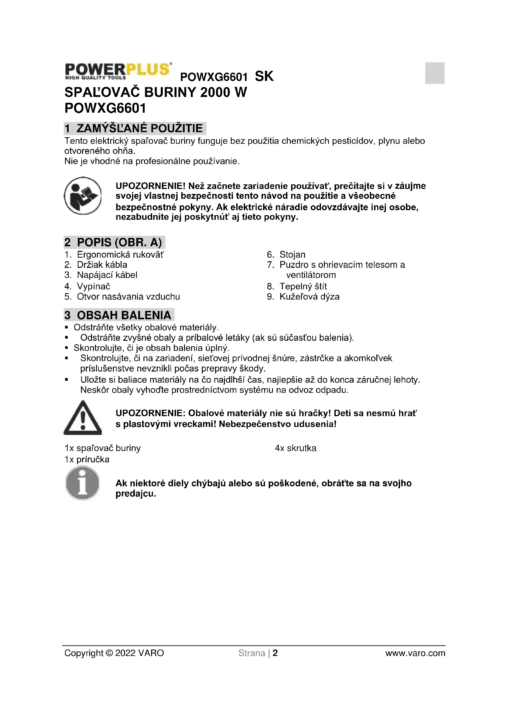 - Doklad o zakúpení si uschovajte, predstavuje doklad o dátume zakúpenia.POWXG6601 SK Copyright © 2022 VARO Strana | 8 www.varo.com