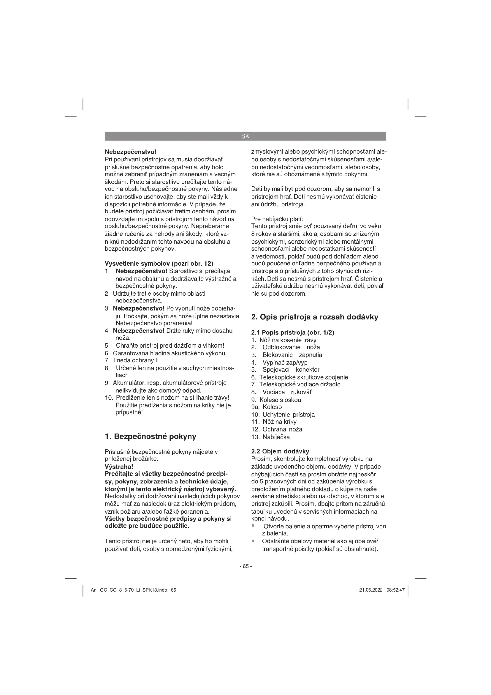 Doba nabíjania je pri prázdnom akumulátore cca 3 – 5 hodín. Počas procesu nabíjania môže dôjsť k čiastočnému zohriatiu akumu- látora v prístroji, čo je však úplne normálne. Nabíjanie Zapojte nabíjačku do sieťovej zásuvky. Rozsvieti sa červená LED dióda (obr. 3/poz. A), ktorá indi- kuje proces nabíjania. Akumulátor sa nabíja. Nabíjanie ukončené Červená LED dióda (obr. 3/poz. A) zhasne. Na- miesto nej sa rozsvieti zelená LED dióda (akumu- látor nabitý). Akumulátor sa nedá nabiť Ak nabíjanie akumulátora nie je možné, skontro- lujte, - či je v zásuvke napätie, - či je kontakt na nabíjacích kontaktoch v bez- chybnom stave, - či súčasne svietia červená a zelená LED dióda (obr. 3/poz. A). Môže k tomu dôjsť na- príklad vtedy, ak je teplota akumulátora príliš nízka alebo príliš vysoká. Prístroj skladujte jeden deň pri izbovej teplote. Ak nabitie akumulátora ešte stále nie je možné, odošlite kompletný prístroj spolu s nabíjačkou do nášho zákazníckeho servisu. Kvôli správnemu odoslaniu kontaktujte náš zákaznícky servis alebo obchod, kde ste prístroj zakúpili. Dbajte pri odosielaní alebo likvidácii akumu- látorov, resp. akumulátorového prístroja na to, aby boli zabalené jednotlivo v umelohmot- ných vreckách aby sa zabránilo skratom a vzniku požiaru! V záujme dlhej životnosti akumulátora by ste sa mali postarať o včasné opätovné nabíjanie aku- mulátora. To je potrebné v každom prípade vtedy, keď zistíte, že sa výkon prístroja začne znižovať. Akumulátor by nemal byť nikdy úplne vybitý. To totiž vedie k poškodeniu akumulátora! Varovanie! Povrchy, ktoré sa majú opracovať, musia byť zbavené všetkých cudzích pred- metov. Varovanie! Spínacie zariadenia inštalované na príst- roji výrobcom sa nesmú odstraňovať ani premosťovať, napr. pripojením spínacie- ho tlačidla na rukoväti, pretože by hrozilo nebezpečenstvo zranenia a zariadenie by sa automaticky nevyplo. Anl_GC_CG_3_6-70_Li_SPK13.indb 67Anl_GC_CG_3_6-70_Li_SPK13.indb 67 21.06.2022 08:52:4721.06.2022 08:52:47SK