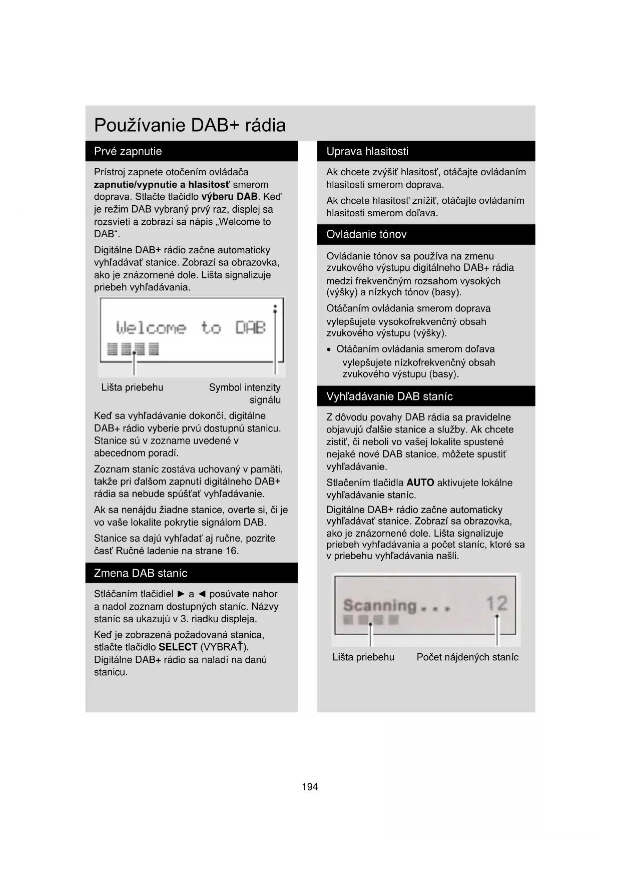 Ak chcete zvýšiť hlasitosť, otáčajte ovládaním hlasitosti smerom doprava. Ak chcete hlasitosť znížiť, otáčajte ovládaním hlasitosti smerom doľava. Ovládanie tónov Ovládanie tónov sa používa na zmenu zvukového výstupu digitálneho DAB+ rádia medzi frekvenčným rozsahom vysokých (výšky) a nízkych tónov (basy). Otáčaním ovládania smerom doprava vylepšujete vysokofrekvenčný obsah zvukového výstupu (výšky). Otáčaním ovládania smerom doľava vylepšujete nízkofrekvenčný obsah zvukového výstupu (basy). Vyhľadávanie DAB staníc Z dôvodu povahy DAB rádia sa pravidelne objavujú ďalšie stanice a služby. Ak chcete zistiť, či neboli vo vašej lokalite spustené nejaké nové DAB stanice, môžete spustiť vyhľadávanie. Stlačením tlačidla AUTO aktivujete lokálne vyhľadávanie staníc. Digitálne DAB+ rádio začne automaticky vyhľadávať stanice. Zobrazí sa obrazovka, ako je znázornené dole. Lišta signalizuje priebeh vyhľadávania a počet staníc, ktoré sa v priebehu vyhľadávania našli.