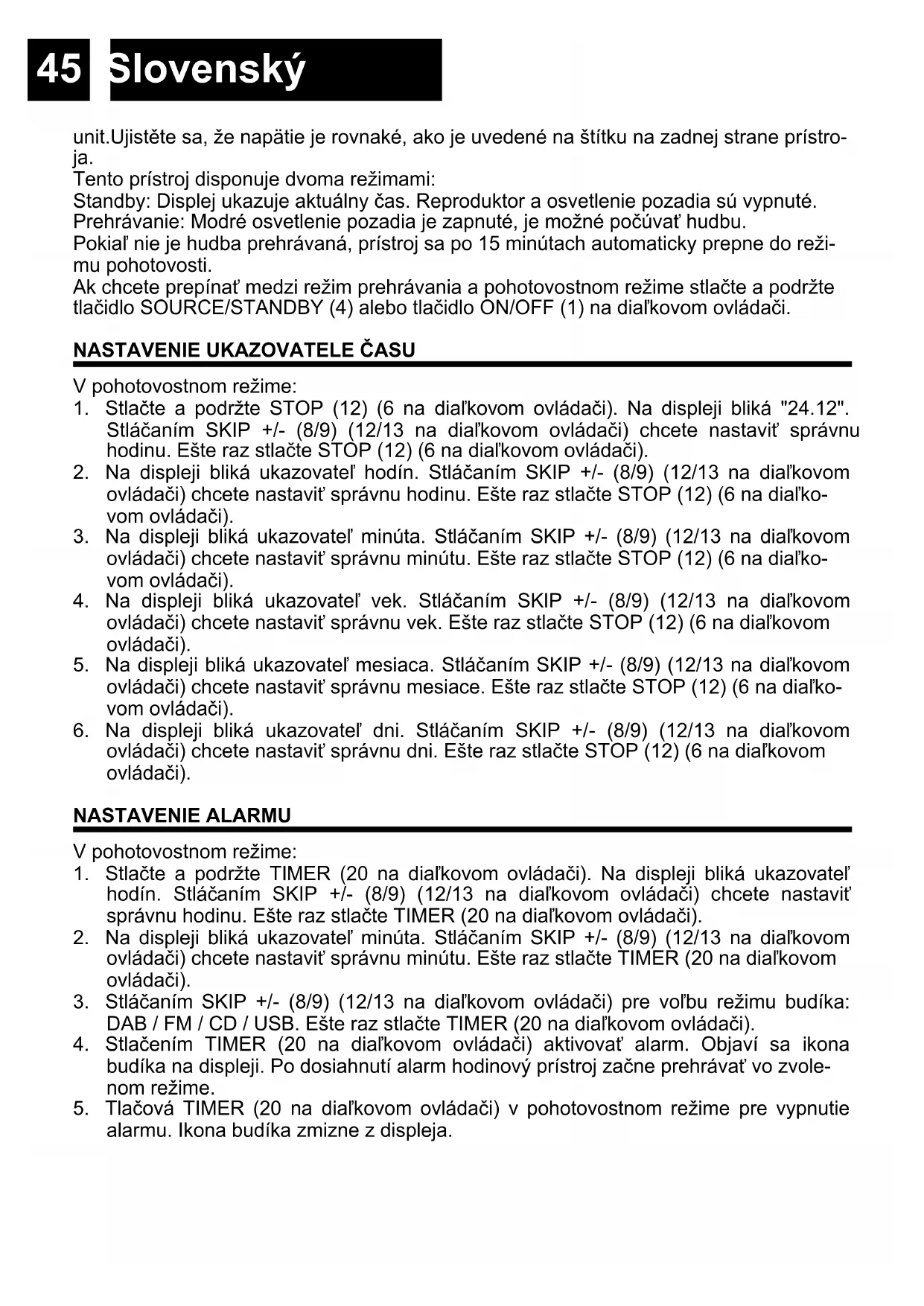 Stláčaním SKIP +/- (8/9) (12/13 na diaľkovom ovládači) chcete nastavi správnu hodinu. Ešte raz stlačte STOP (12) (6 na diaľkovom ovládači).