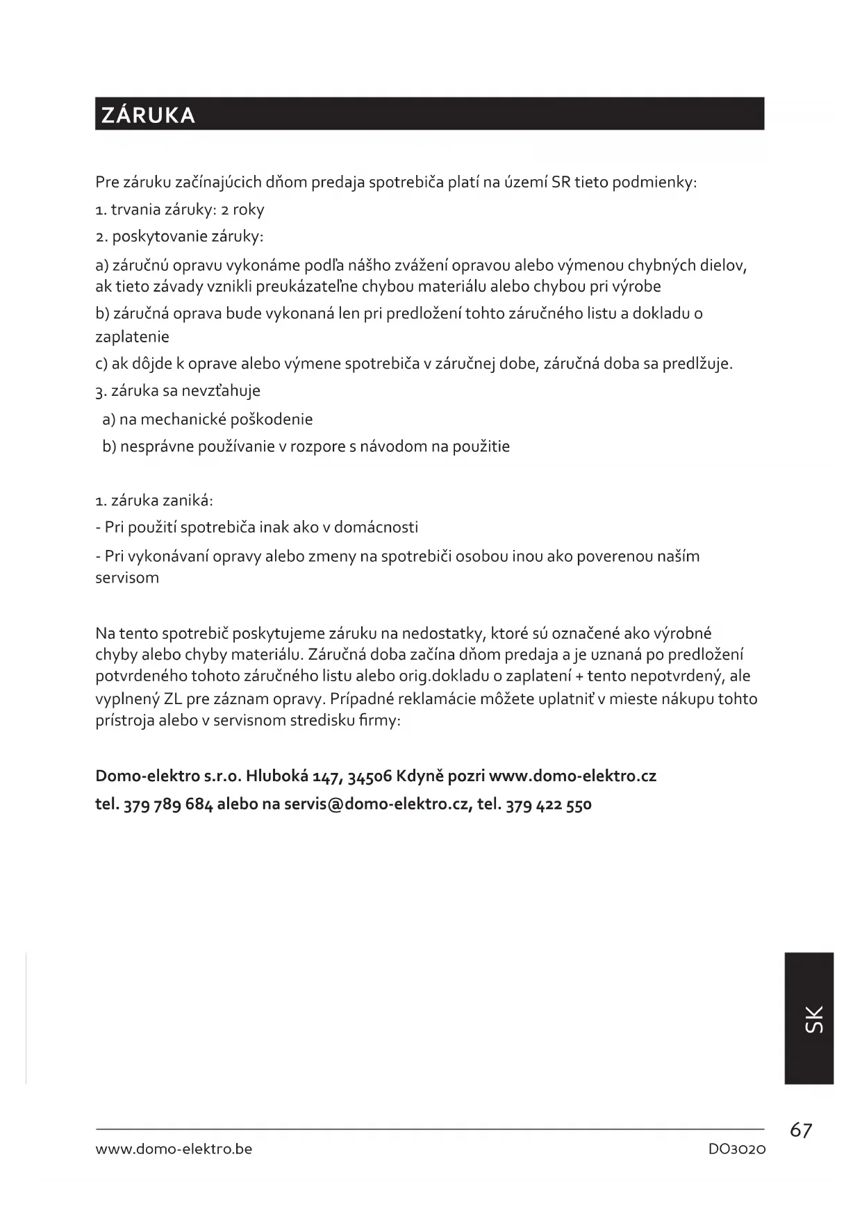 - Pri použití spotrebiča inak ako v domácnosti - Pri vykonávaní opravy alebo zmeny na spotrebiči osobou inou ako poverenou naším servisom Na tento spotrebič poskytujeme záruku na nedostatky, ktoré sú označené ako výrobné chyby alebo chyby materiálu. Záručná doba začína dňom predaja a je uznaná po predložení potvrdeného tohoto záručného listu alebo orig.dokladu o zaplatení + tento nepotvrdený, ale vyplnený ZL pre záznam opravy. Prípadné reklamácie môžete uplatniť v mieste nákupu tohto prístroja alebo v servisnom stredisku rmy: Domo-elektro s.r.o. Hluboká 147, 34506 Kdyně pozri www.domo-elektro.cz tel. 379 789 684 alebo na servis@domo-elektro.cz, tel. 379 422 55068 DO3020