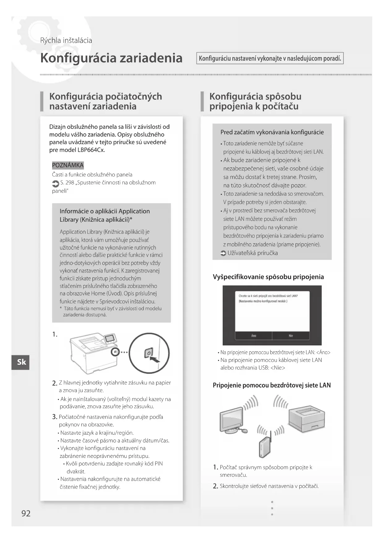 Konfigurácia zariadenia Konfiguráciu nastavení vykonajte v nasledujúcom poradí. Rýchlainštalácia SkPodrobnosti nájdete v časti „Inštalácia pomocou sprievodcu inštaláciou“ v dokumente Užívateľská príručka Zapíšte si identifikátor SSID a sieťový kľúč.•Skontrolujteetiketunasmerovači. Užívateľská príručka•Činnosťnastaveniajejednoduchšia,akjesmerovač vybavený značkou WPS. Užívateľská príručka Podľa pokynov na obrazovke nižšie nastavte prístupový bod a sieťový kľúč.1. Vyberte <OK>.2. Vyberte <Nastavenia SSID>.3. Vyberte <Vybrať prístupový bod>.4. Vyberteprístupovýbod(identifikátorSSID)avyberte<Ďalej>.5. ZadajtekľúčWEP(sieťovýkľúč)avyberte<Použiť>.6. Vyberte<Áno>.•Počkajtenazobrazeniesprávy<Pripojené.>.7. Vyberte<Zatvoriť>.•AdresaIPsaoniekoľkominútautomatickynakonfiguruje. Nainštalujte ovládač a softvér. S. 94 „Inštalácia softvéru“Teraz ste dokončili konfiguráciu počiatočných nastavení. Pripojenie pomocou káblovej siete LAN Zariadenie sa nedodáva so sieťovým káblom LAN.V prípade potreby si kábel obstarajte. Počítač správnym spôsobom pripojte k smerovaču. Skontrolujte sieťové nastavenia v počítači. Pripojte sieťový kábel LAN.•Popripojeníkáblaniekoľkominútpočkajte(kýmsaautomatickynastavíadresaIP).•AkstatickúadresuIPnastavilpočítač,IPadresuzariadenia nastavte ručne. Nainštalujte ovládač a softvér. S. 94 „Inštalácia softvéru“Teraz ste dokončili konfiguráciu počiatočných nastavení.