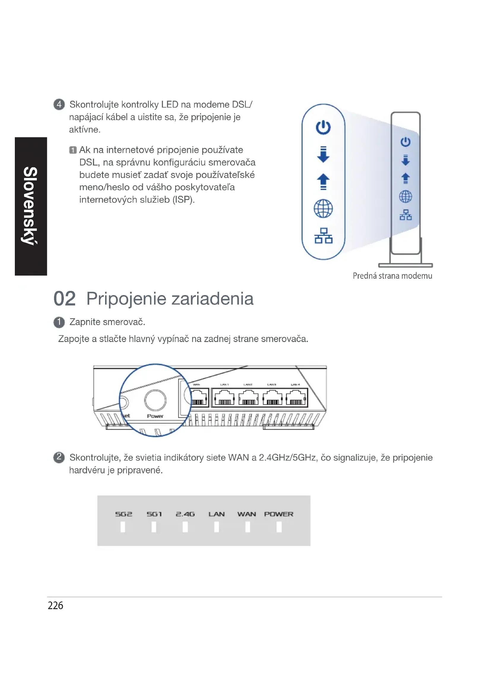 Skontrolujte kontrolky LED na modeme DSL/ napájací kábel a uistite sa, že pripojenie je aktívne. Ak na internetové pripojenie používate DSL, na správnu konfiguráciu smerovača budete musieť zadať svoje používateľské meno/heslo od vášho poskytovateľa internetových služieb (ISP). Pripojenie zariadenia