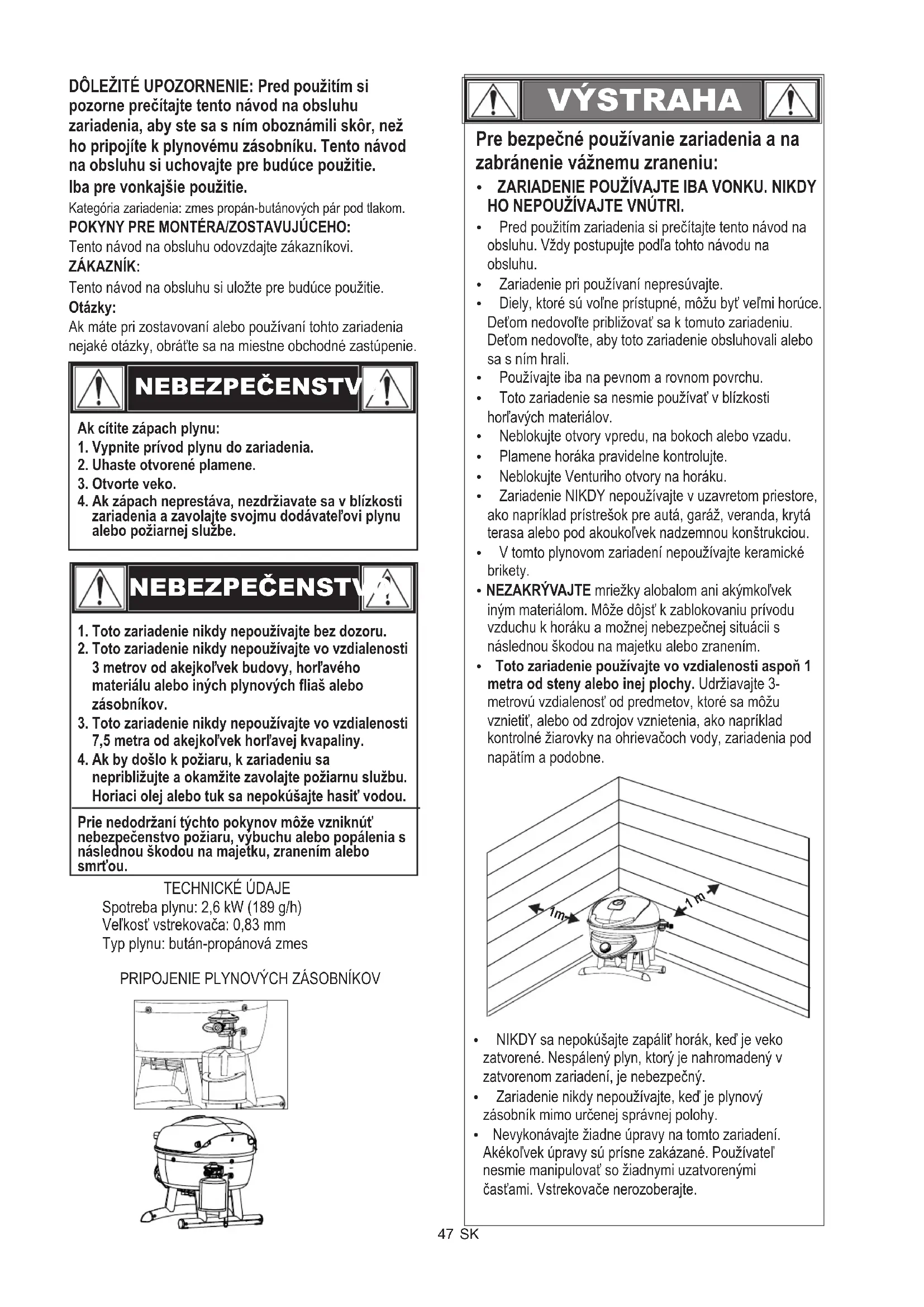 NEBEZPEČENSTVO Ak cítite zápach plynu:1. Vypnite prívod plynu do zariadenia.2. Uhaste otvorené plamene.3. Otvorte veko.4. Ak zápach neprestáva, nezdržiavate sa v blízkosti zariadenia a zavolajte svojmu dodávateľovi plynu alebo požiarnej službe.TECHNICKÉ ÚDAJE NEBEZPEČENSTVO Prie nedodržaní týchto pokynov môže vzniknúť nebezpečenstvo požiaru, výbuchu alebo popálenia s následnou škodou na majetku, zranením alebo smrťou.Spotreba plynu: 2,6 kW (189 g/h)Veľkosť vstrekovača: 0,83 mmTyp plynu: bután-propánová zmesPRIPOJENIE PLYNOVÝCH ZÁSOBNÍKOV DÔLEŽITÉ UPOZORNENIE: Pred použitím si pozorne prečítajte tento návod na obsluhu zariadenia, aby ste sa s ním oboznámili skôr, než ho pripojíte k plynovému zásobníku. Tento návod na obsluhu si uchovajte pre budúce použitie. Iba pre vonkajšie použitie. Kategória zariadenia: zmes propán-butánových pár pod tlakom.POKYNY PRE MONTÉRA/ZOSTAVUJÚCEHO:Tento návod na obsluhu odovzdajte zákazníkovi.ZÁKAZNÍK:Tento návod na obsluhu si uložte pre budúce použitie.Otázky:Ak máte pri zostavovaní alebo používaní tohto zariadenia nejaké otázky, obráťte sa na miestne obchodné zastúpenie. VÝSTRAHA Pre bezpečné používanie zariadenia a na zabránenie vážnemu zraneniu:
