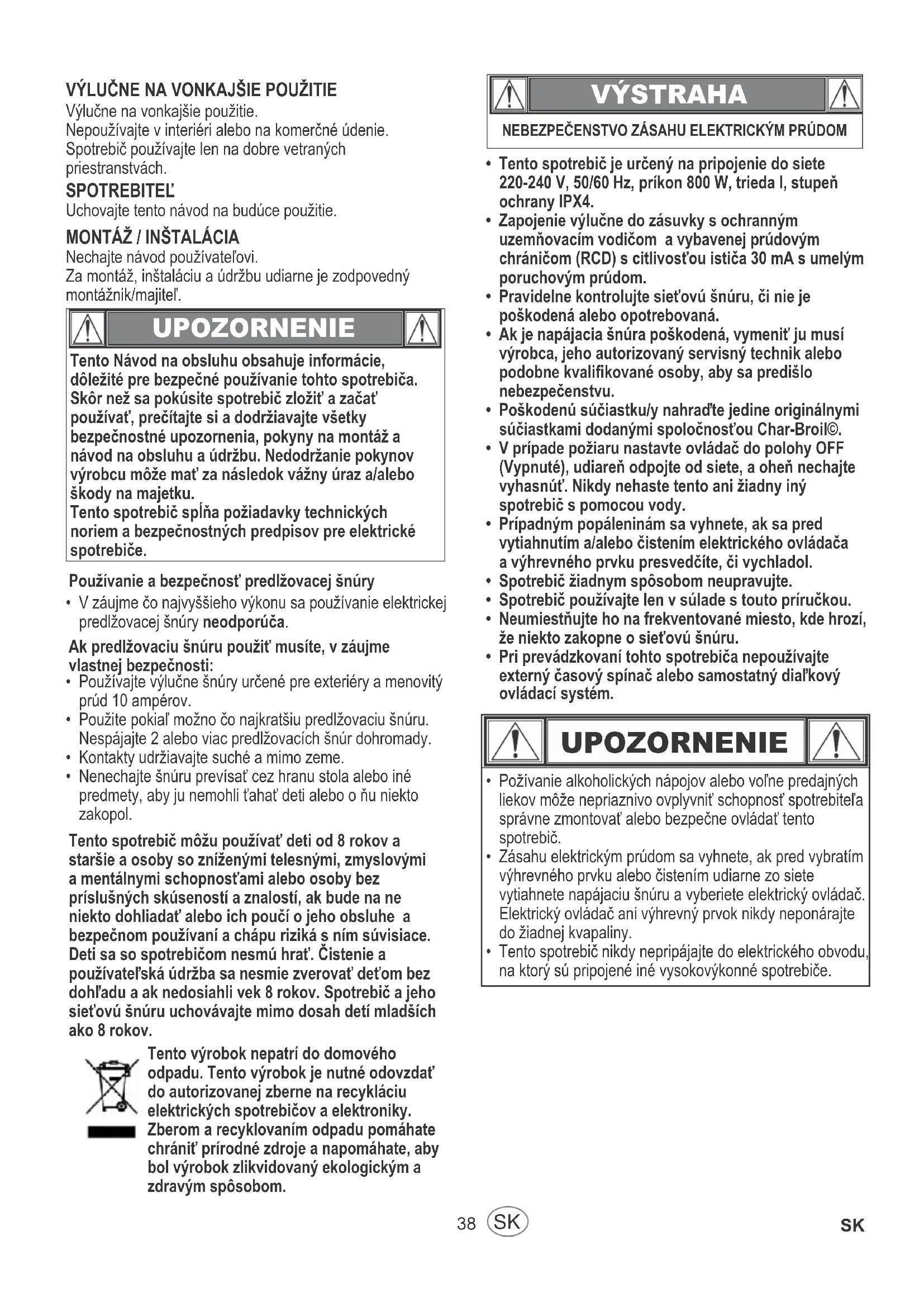 - Pri prevádzkovaní tohto spotrebiča nepoužívajte externý časový spínač alebo samostatný diaľkový ovládací systém. UPOZORNENIE VÝLUČNE NA VONKAJŠIE POUŽITIE39