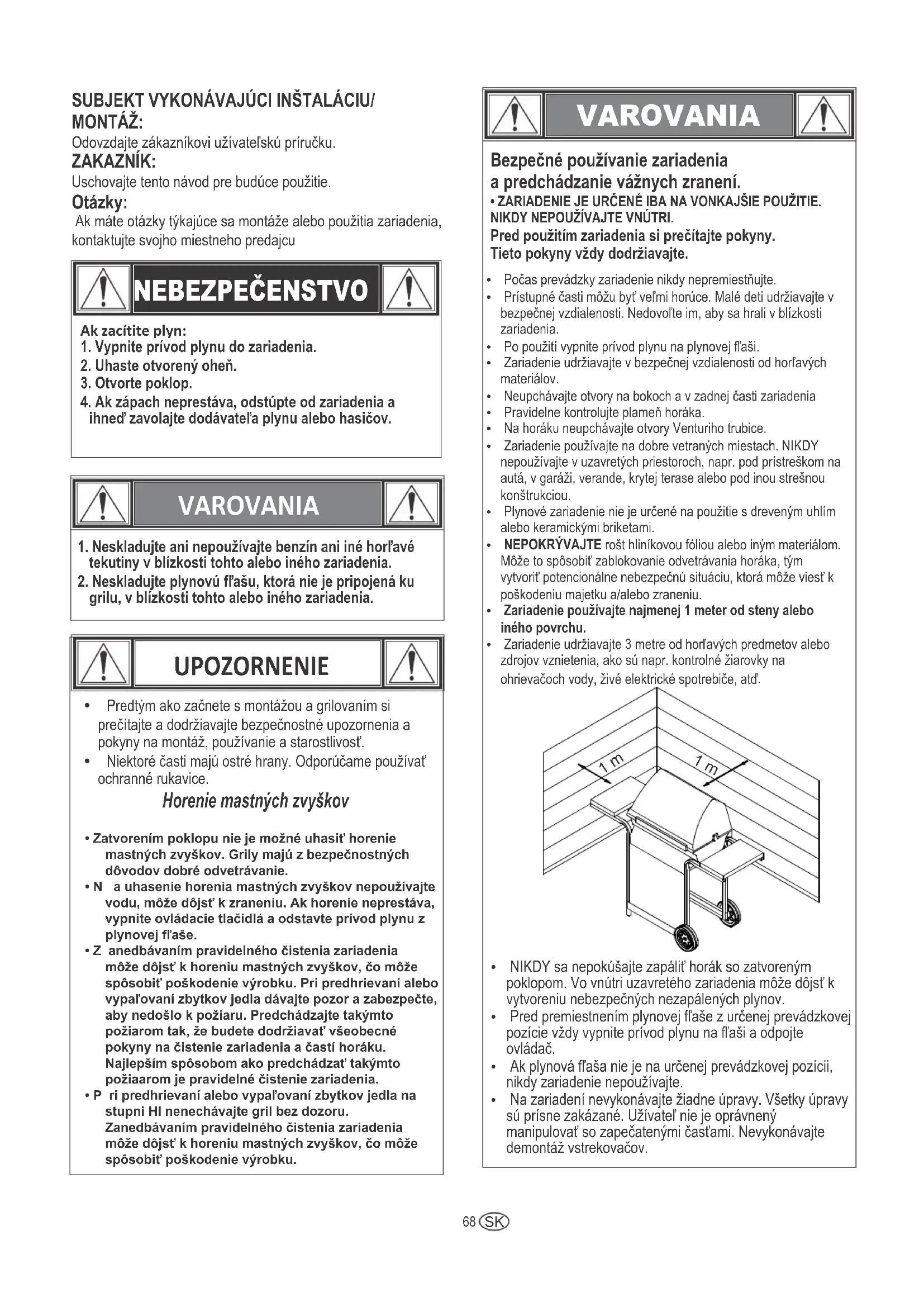 - ZARIADENIE JE URČENÉ IBA NA VONKAJŠIE POUŽITIE.NIKDY NEPOUŽÍVAJTE VNÚTRI. Pred použitím zariadenia si prečítajte pokyny. Tieto pokyny vždy dodržiavajte. Ÿ Počas prevádzky zariadenie nikdy nepremiestňujte.Ÿ Prístupné časti môžu byť veľmi horúce. Malé deti udržiavajte vbezpečnej vzdialenosti. Nedovoľte im, aby sa hrali v blízkostizariadenia.Ÿ Po použití vypnite prívod plynu na plynovej fľaši.Ÿ Zariadenie udržiavajte v bezpečnej vzdialenosti od horľavýchmateriálov.Ÿ Neupchávajte otvory na bokoch a v zadnej časti zariadeniaŸ Pravidelne kontrolujte plameň horáka.Ÿ Na horáku neupchávajte otvory Venturiho trubice.Ÿ Zariadenie používajte na dobre vetraných miestach. NIKDYnepoužívajte v uzavretých priestoroch, napr. pod prístreškom naautá, v garáži, verande, krytej terase alebo pod inou strešnoukonštrukciou.Ÿ Plynové zariadenie nie je určené na použitie s dreveným uhlímalebo keramickými briketami.Ÿ NEPOKRÝVAJTE rošt hliníkovou fóliou alebo iným materiálom.Môže to spôsobiť zablokovanie odvetrávania horáka, týmvytvoriť potencionálne nebezpečnú situáciu, ktorá môže viesť kpoškodeniu majetku a/alebo zraneniu.Ÿ Zariadenie používajte najmenej 1 meter od steny aleboiného povrchu.Ÿ Zariadenie udržiavajte 3 metre od horľavých predmetov alebozdrojov vznietenia, ako sú napr. kontrolné žiarovky na ohrievačoch vody, živé elektrické spotrebiče, atď.Ÿ NIKDY sa nepokúšajte zapáliť horák so zatvoreným poklopom. Vo vnútri uzavretého zariadenia môže dôjsť k vytvoreniu nebezpečných nezapálených plynov. Ÿ Pred premiestnením plynovej fľaše z určenej prevádzkovej pozície vždy vypnite prívod plynu na fľaši a odpojte ovládač. Ÿ Ak plynová fľaša nie je na určenej prevádzkovej pozícii, nikdy zariadenie nepoužívajte. Ÿ Na zariadení nevykonávajte žiadne úpravy. Všetky úpravy sú prísne zakázané. Užívateľ nie je oprávnený manipulovať so zapečatenými časťami. Nevykonávajte demontáž vstrekovačov.