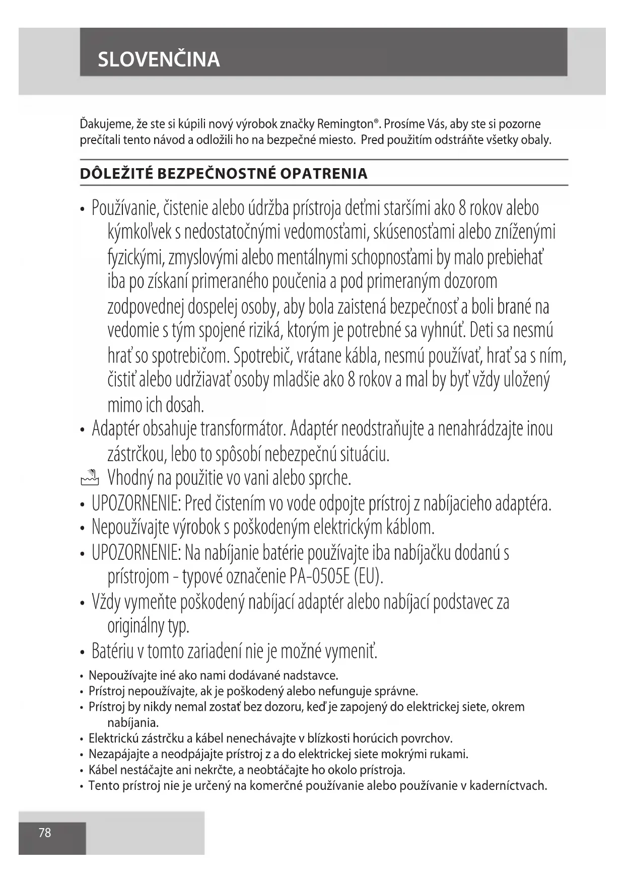 NO78 Ďakujeme, že ste si kúpili nový výrobok značky Remington®. Prosíme Vás, aby ste si pozorne prečítali tento návod a odložili ho na bezpečné miesto. Pred použitím odstráňte všetky obaly.