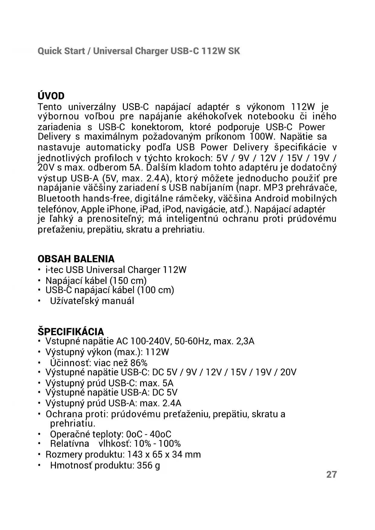 Dostępne na naszych stronach www.i-tec.cz/pl w zakładce „FAQ“ przy niniejszym produkcie.27 Quick Start / Universal Charger USB-C 112W SK ÚVOD Tento univerzálny USB-C napájací adaptér s výkonom 112W je výbornou voľbou pre napájanie akéhokoľvek notebooku či iného zariadenia s USB-C konektorom, ktoré podporuje USB-C Power Delivery s maximálnym požadovaným príkonom 100W. Napätie sa nastavuje automaticky podľa USB Power Delivery špecifikácie v jednotlivých profiloch v týchto krokoch: 5V / 9V / 12V / 15V / 19V / 20V s max. odberom 5A. Ďalším kladom tohto adaptéru je dodatočný výstup USB-A (5V, max. 2.4A), ktorý môžete jednoducho použiť pre napájanie väčšiny zariadení s USB nabíjaním (napr. MP3 prehrávače, Bluetooth hands-free, digitálne rámčeky, väčšina Android mobilných telefónov, Apple iPhone, iPad, iPod, navigácie, atď.). Napájací adaptér je ľahký a prenositeľný; má inteligentnú ochranu proti prúdovému preťaženiu, prepätiu, skratu a prehriatiu. OBSAH BALENIA