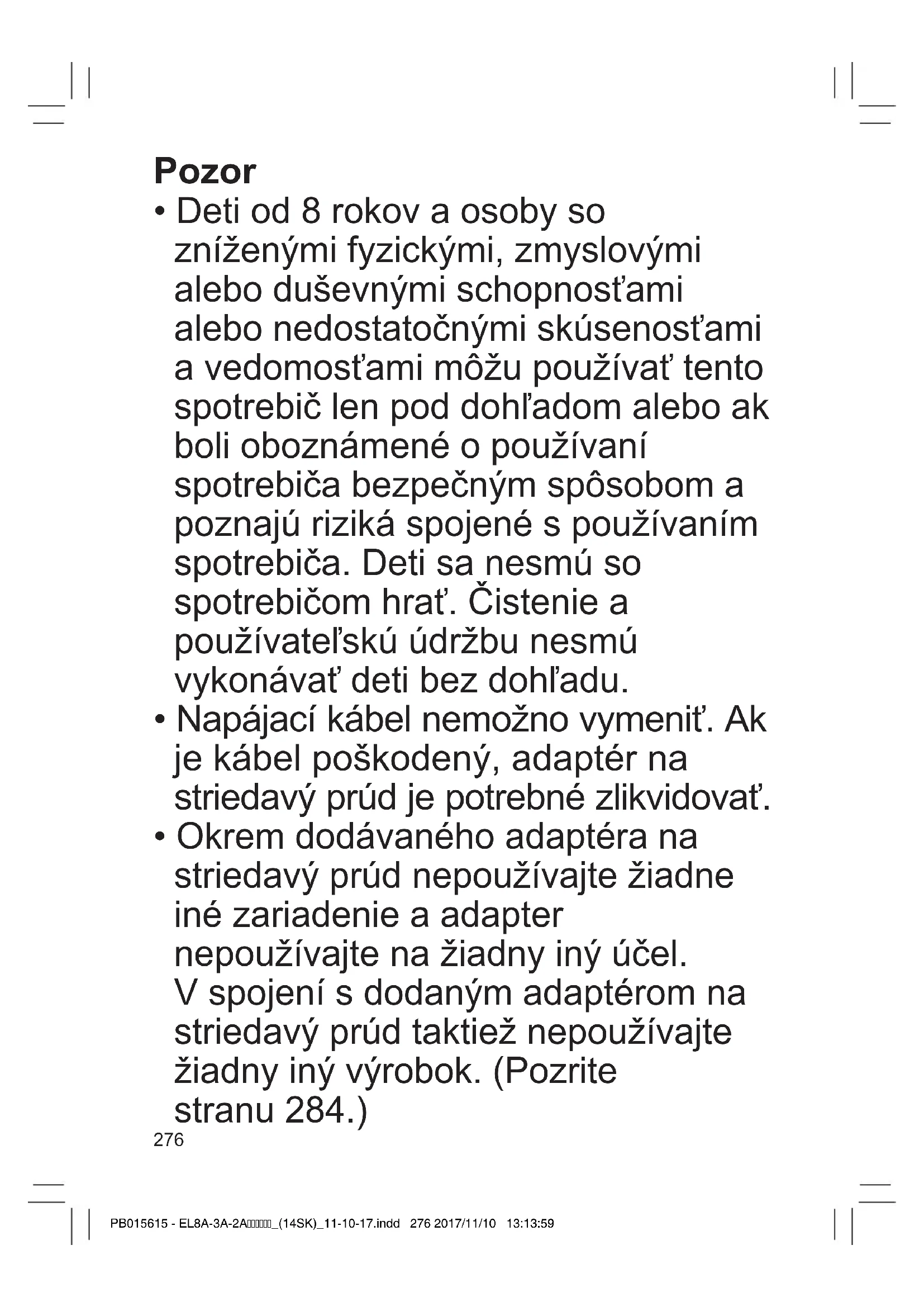 - Okrem dodávaného adaptéra na striedavý prúd nepoužívajte žiadne iné zariadenie a adapter nepoužívajte na žiadny iný účel. V spojení s dodaným adaptérom na striedavý prúd taktiež nepoužívajte žiadny iný výrobok. (Pozrite stranu 284.) PB015615 - EL8A-3A-2A_(14SK)_11-10-17.indd 276 2017/11/10 13:13:59277 GBDFINLEDKPNSFINPLCZSKHROTR